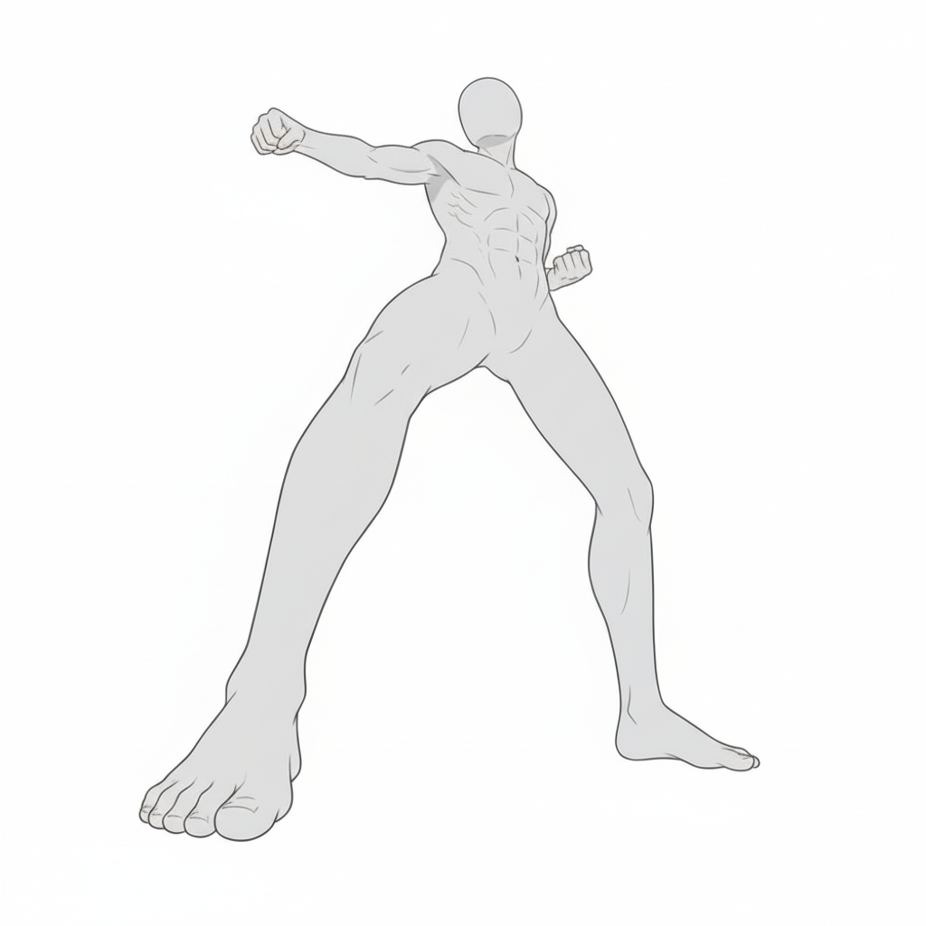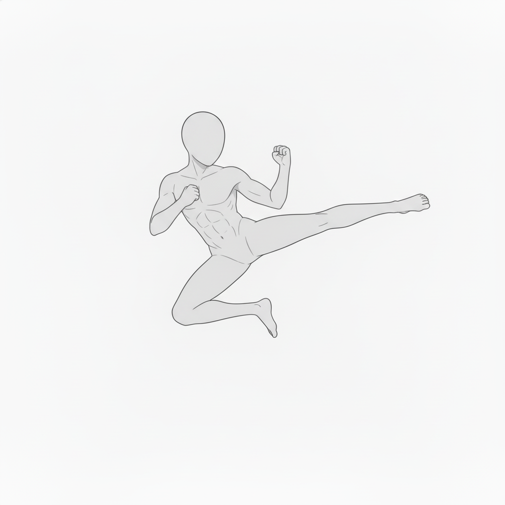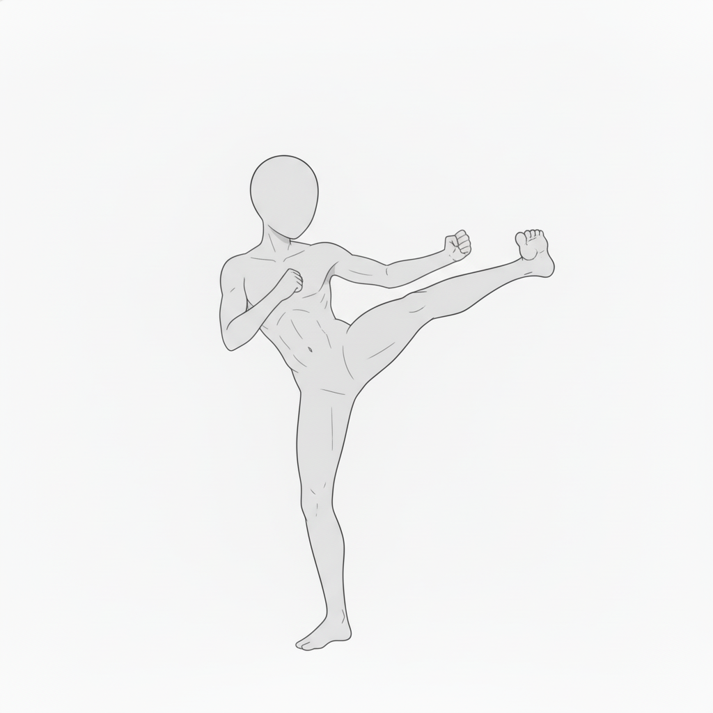 軸足で安定しながら高く横蹴りを行う姿勢を描き、フォーム解説に向いています。