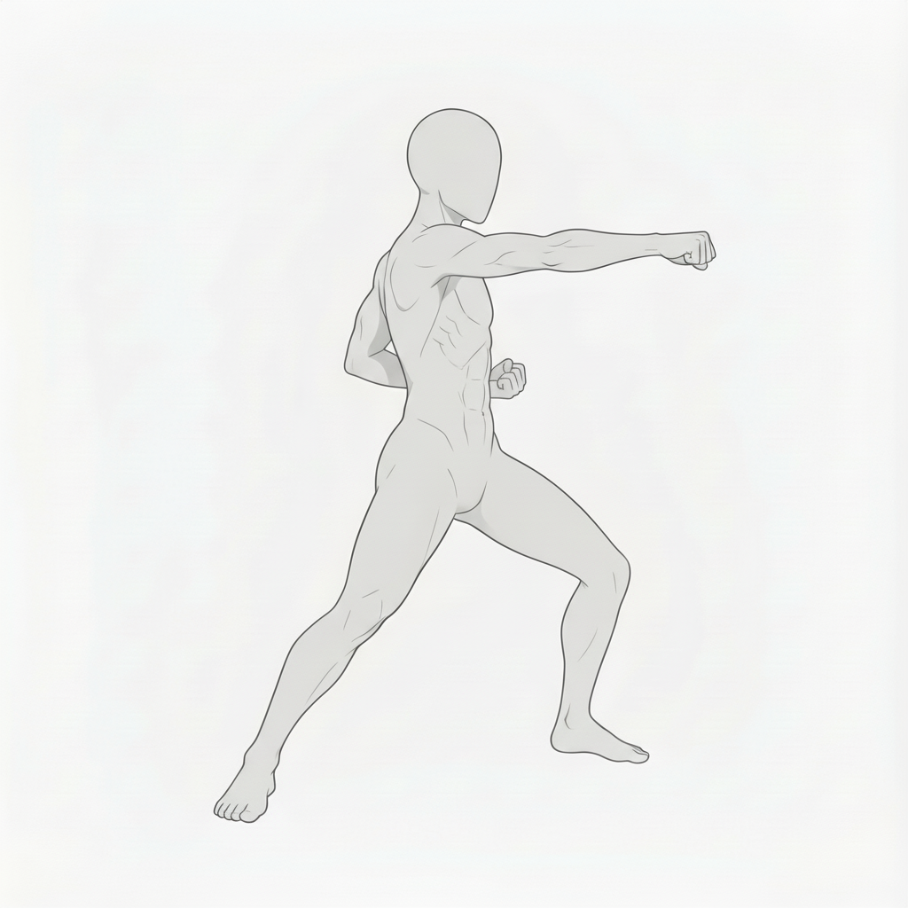 足元から見上げる構図で突きを表現し、力強さと躍動感を強調できるポーズです。