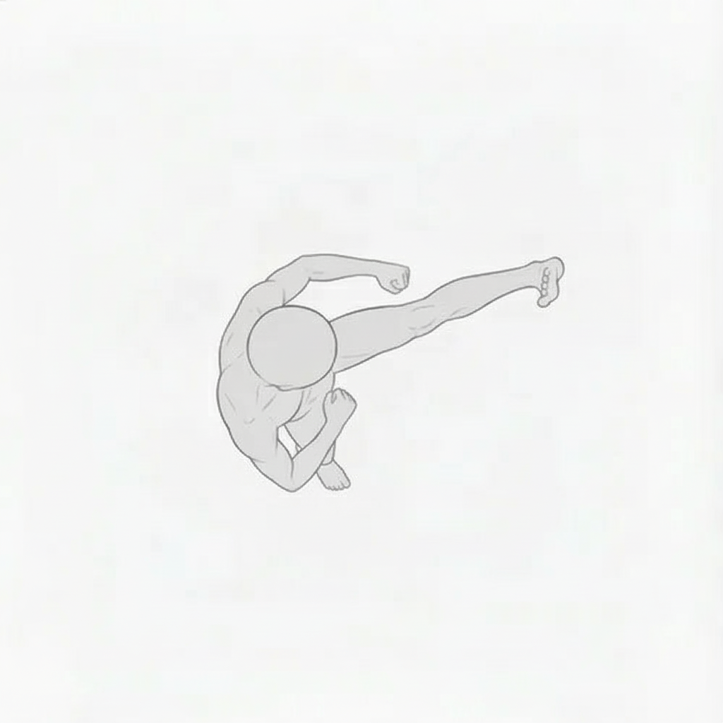 上から見た横蹴り動作で、空間把握や構図研究に役立つポーズ素材です。
