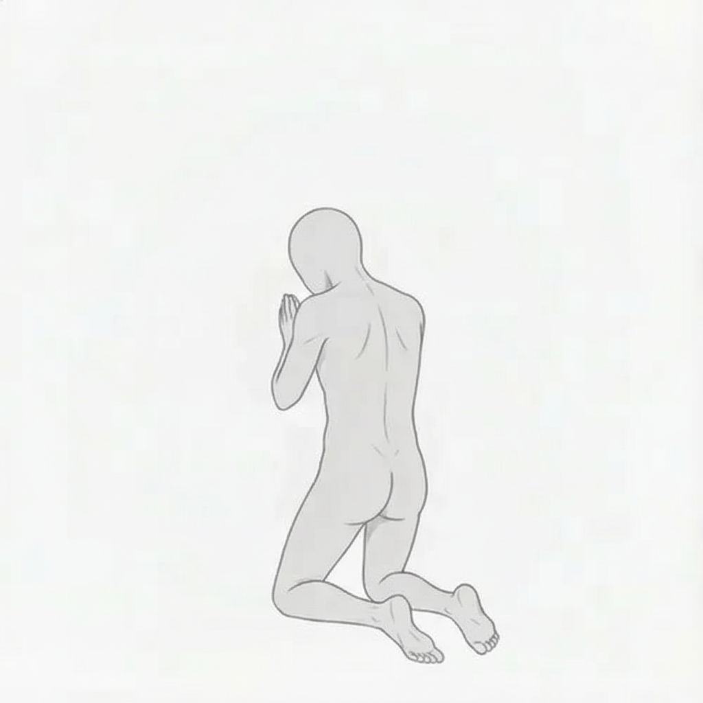 背中のラインと静かな佇まいが映え、祈り・内省・決意のシーンに適したポーズです。