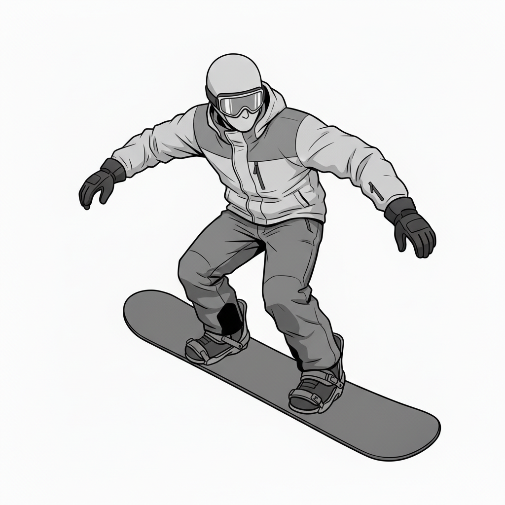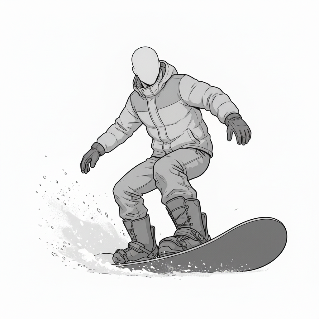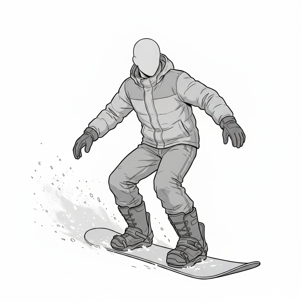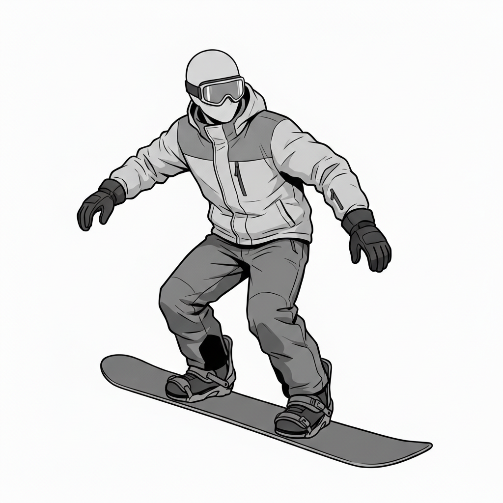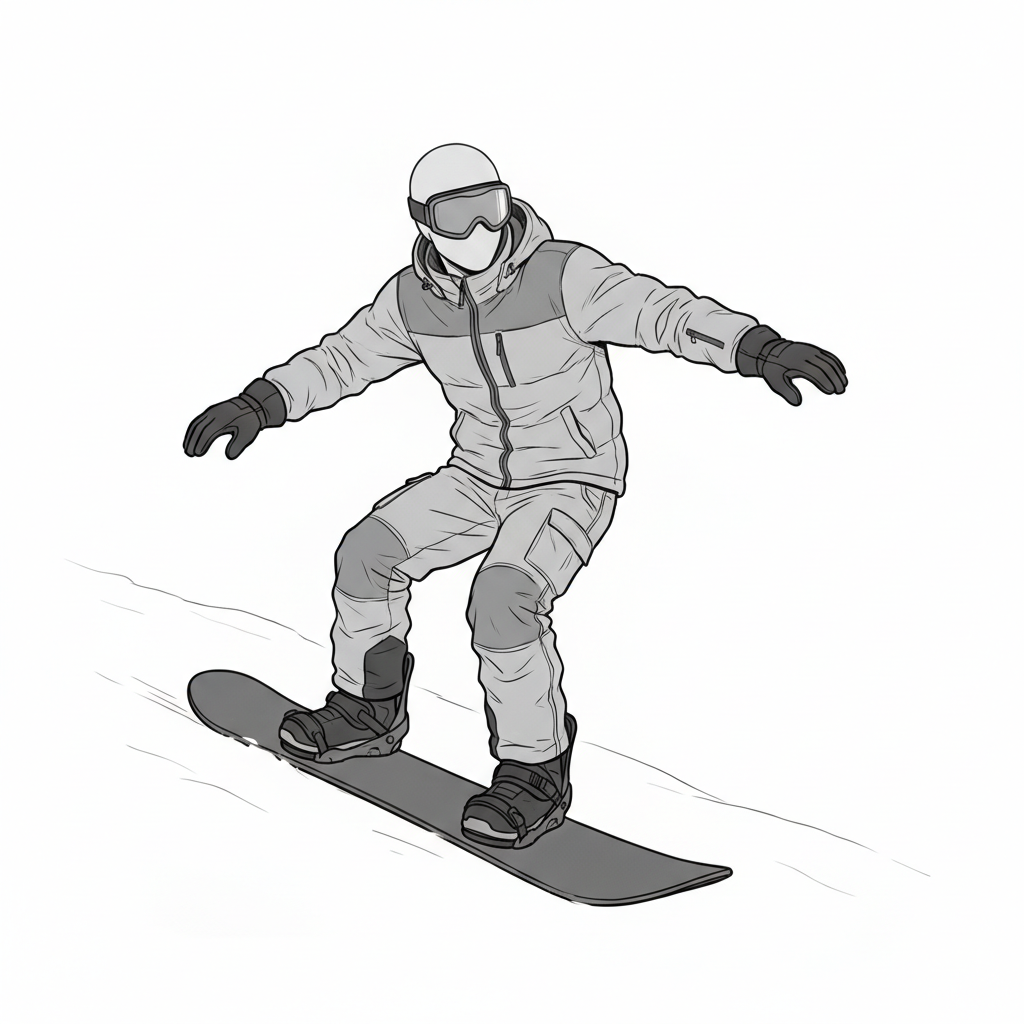 自然な前傾姿勢と腕の広がりを捉えた、使いやすい男性スノーボードポーズ素材です。