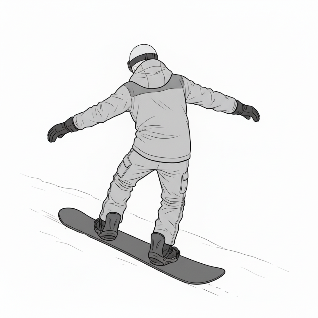 背中・腰・ボード角度の関係が分かる、後方からの男性スノーボードポーズ素材です。