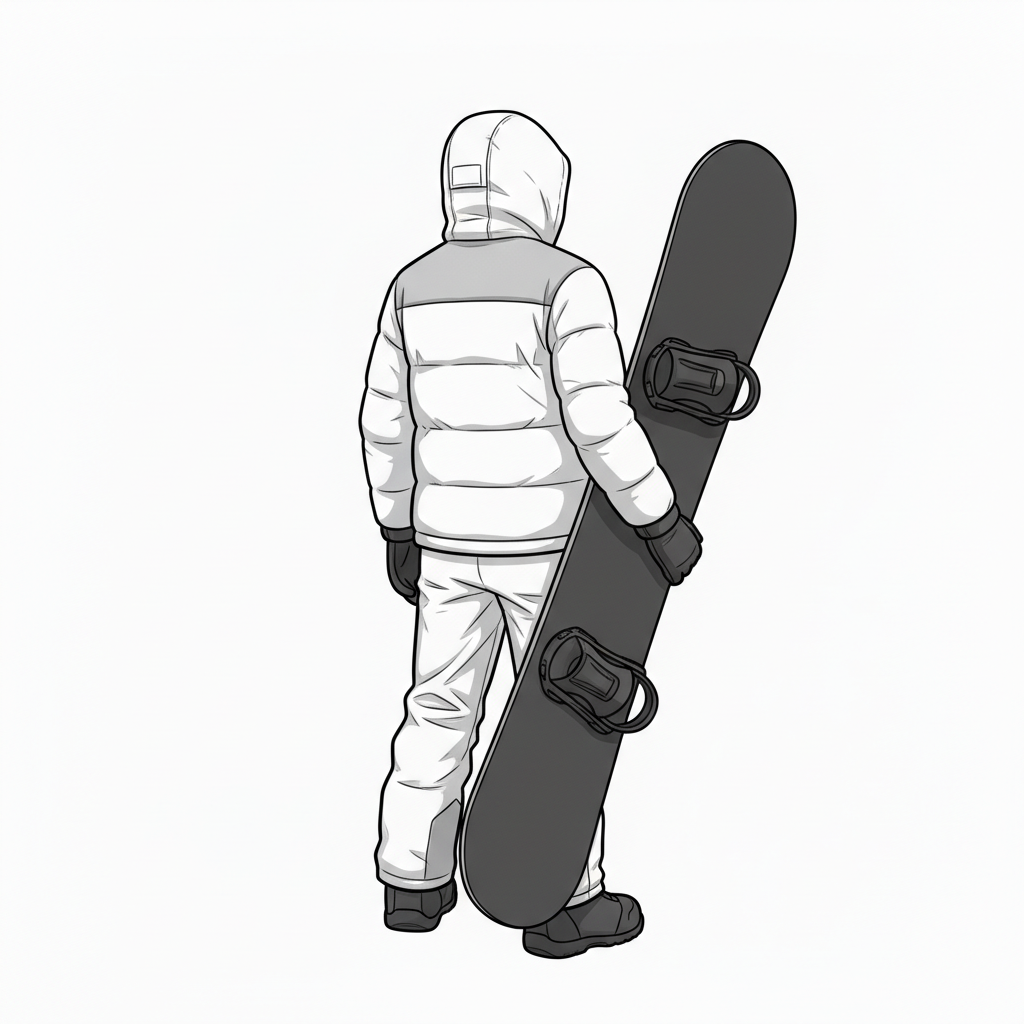 スノーボード携行・後方視点の男性ポーズ|移動シーン素材