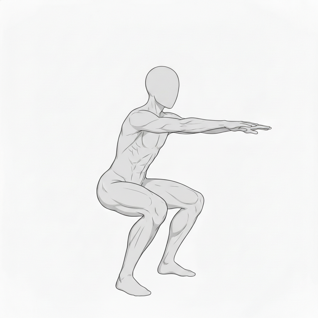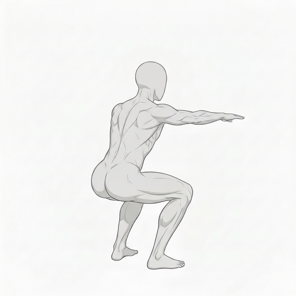後ろ姿のスクワット構図が、臀部と脚の筋肉表現に向いています。