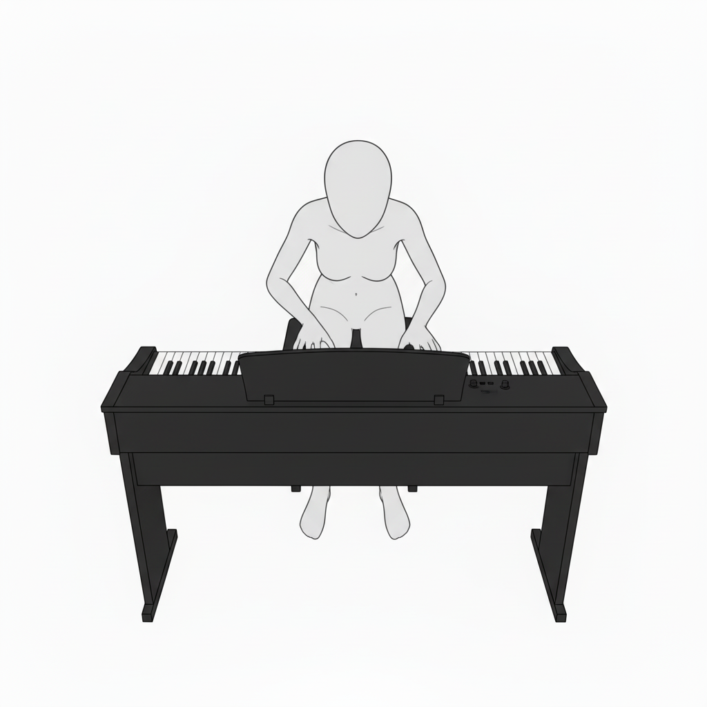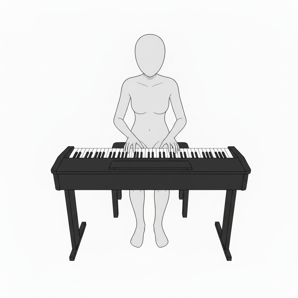 鍵盤と体の位置関係が明確な真正面からの構図。演奏フォームの基礎資料に最適です。