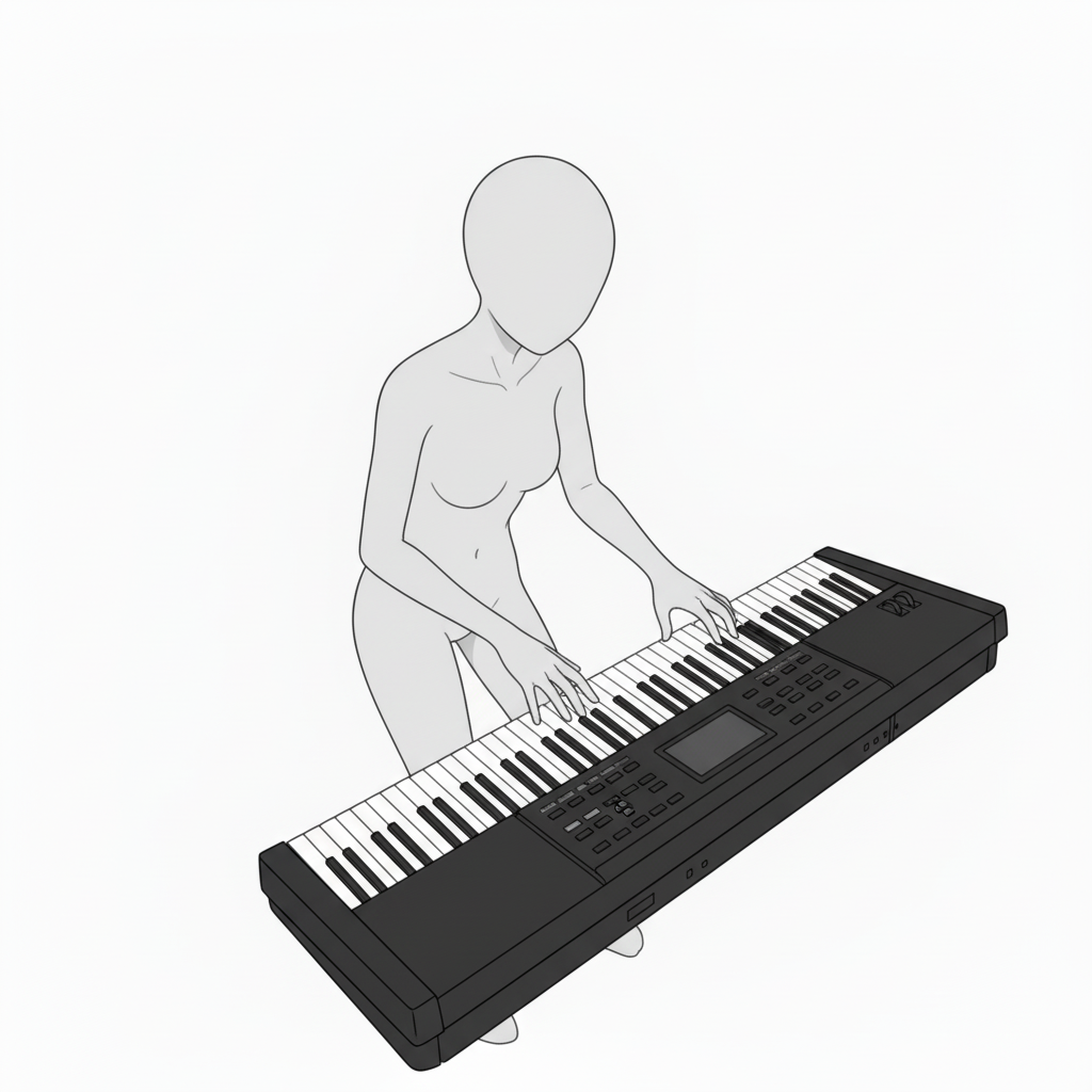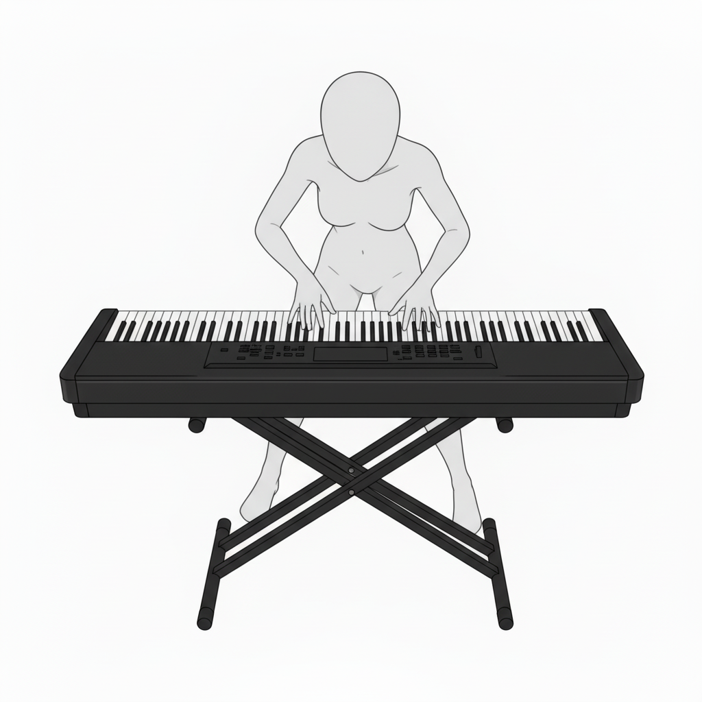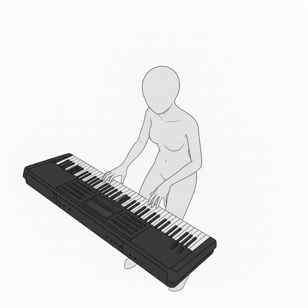 鍵盤全体と姿勢を捉えた構図。楽曲練習や演奏シーンの作画参考におすすめです。