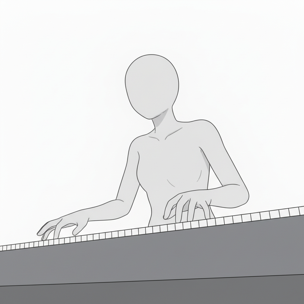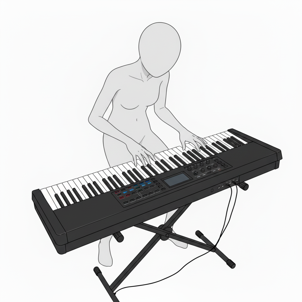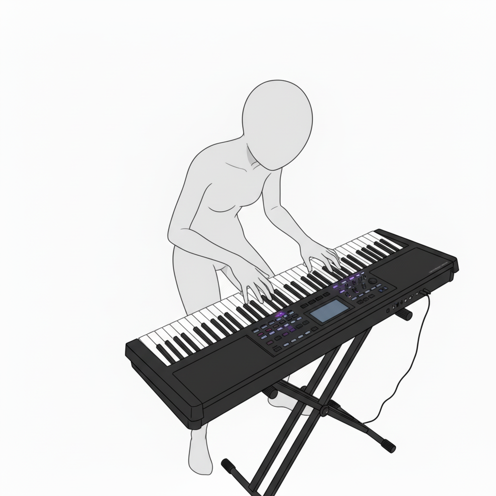 鍵盤全体と姿勢を捉えた構図。楽曲練習や演奏シーンの作画参考におすすめです。