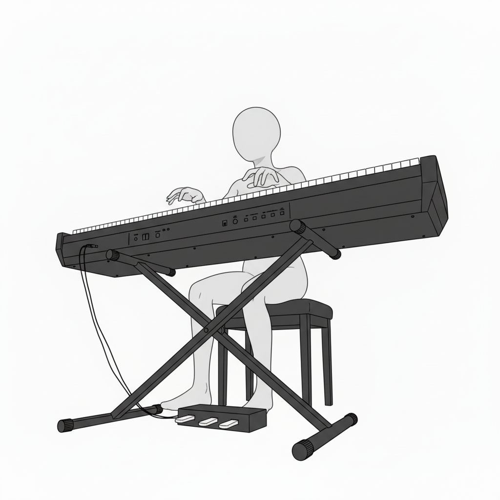 リラックスした姿勢で鍵盤に向かう構図。自宅練習や穏やかな演奏シーンに最適です。