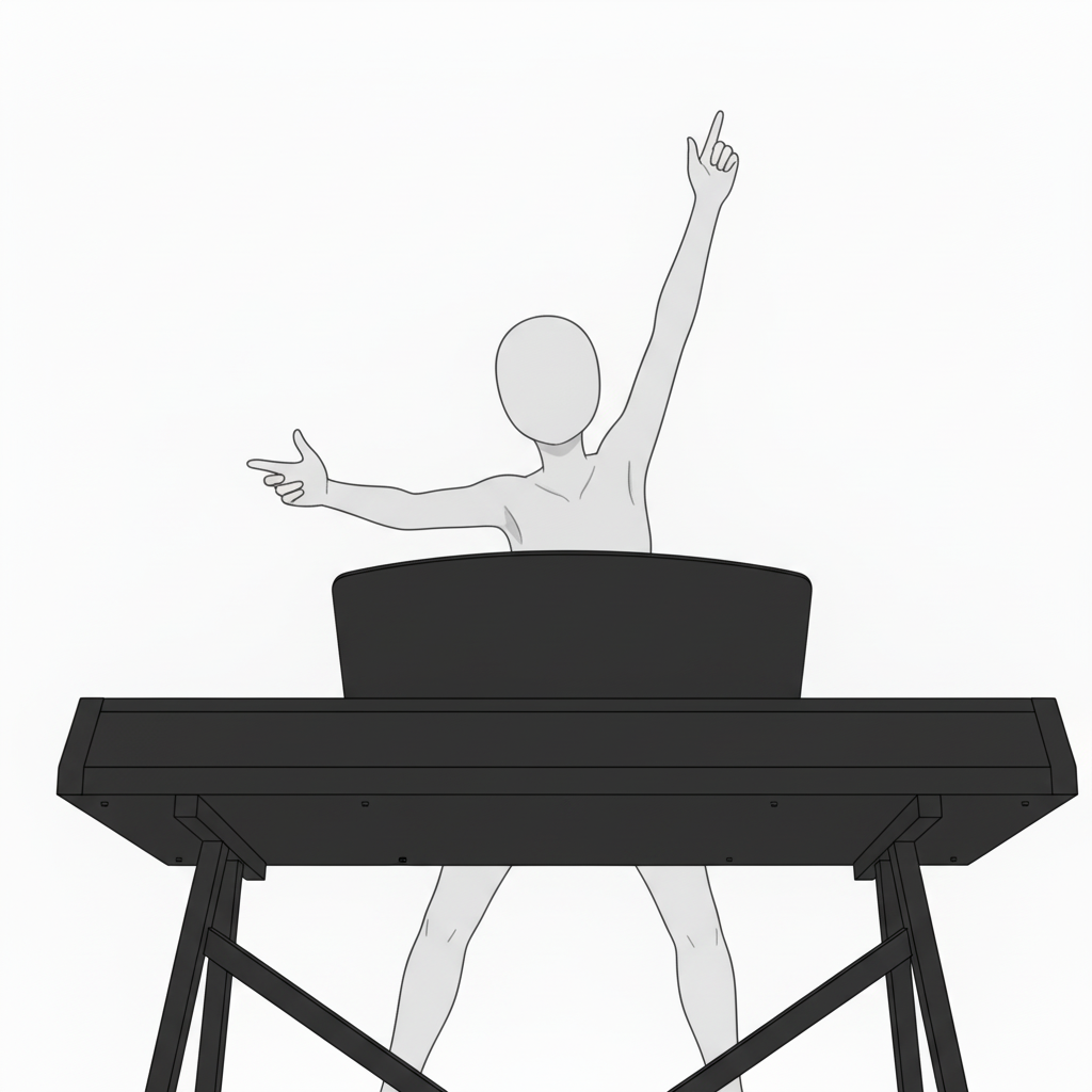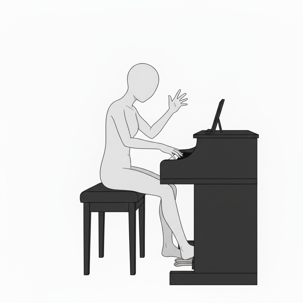ピアノで手を上げる指導ポーズ|レッスンや指揮シーンの描写に