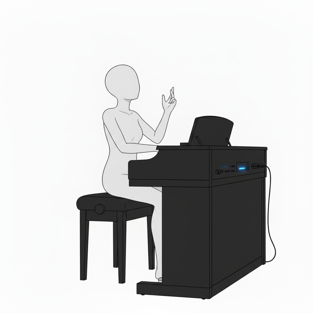 座りながら演奏する電子ピアノポーズ|落ち着いた雰囲気の演奏描写に
