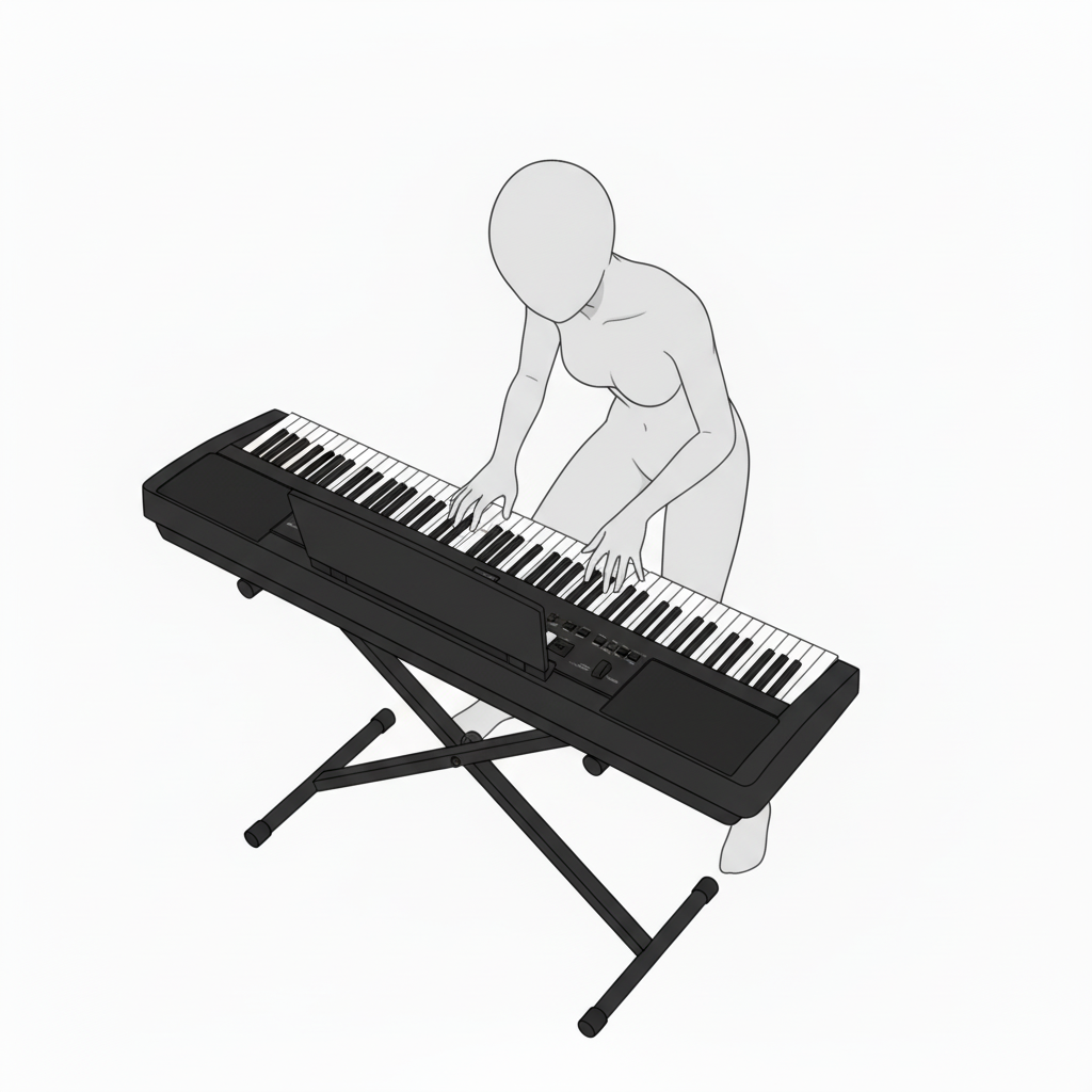 斜め上から見た電子ピアノ演奏ポーズ|立体感あるステージ構図