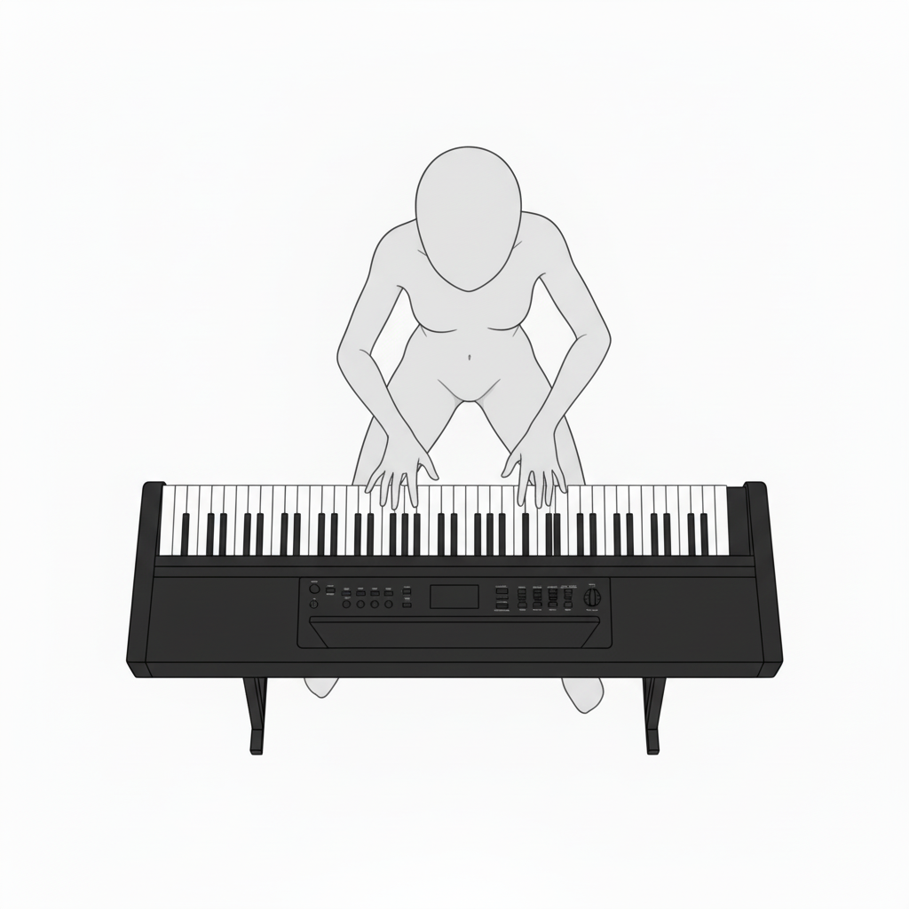 鍵盤と体の位置関係が分かる真上視点。練習風景や独奏シーンに最適です。