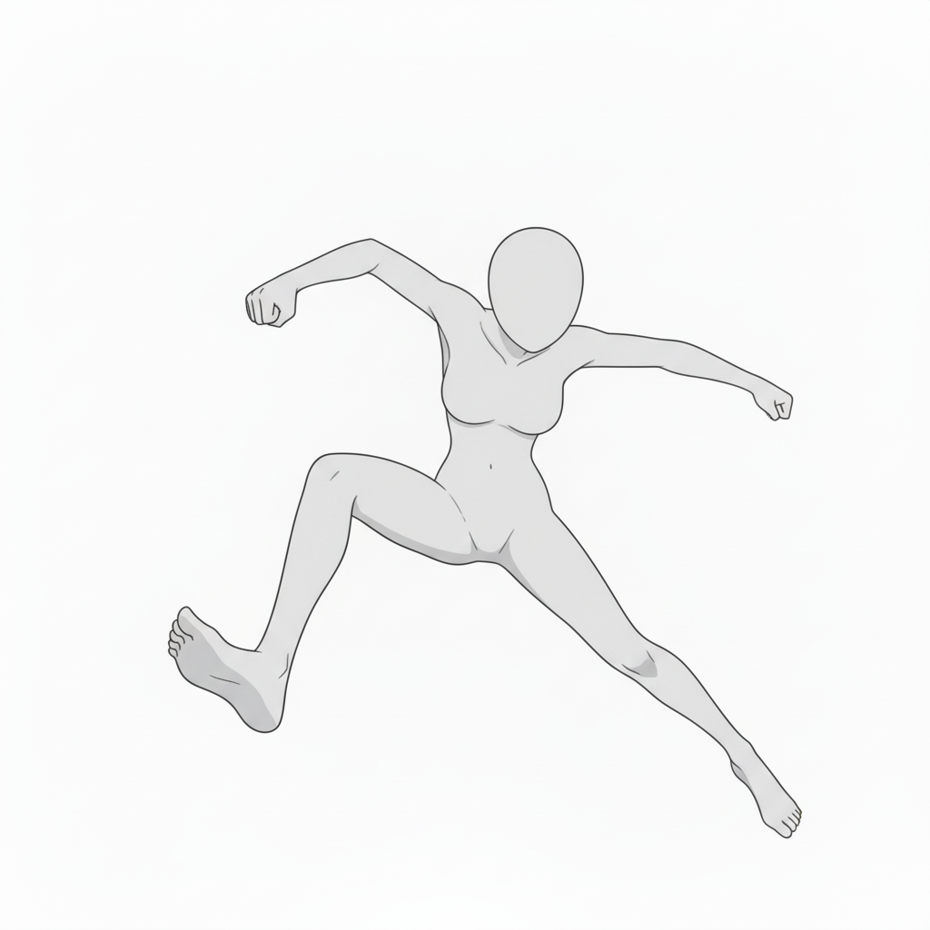 勢いよく横に跳び上がって走り出す全身ポーズ。アクション・格闘・空中シーンに最適。