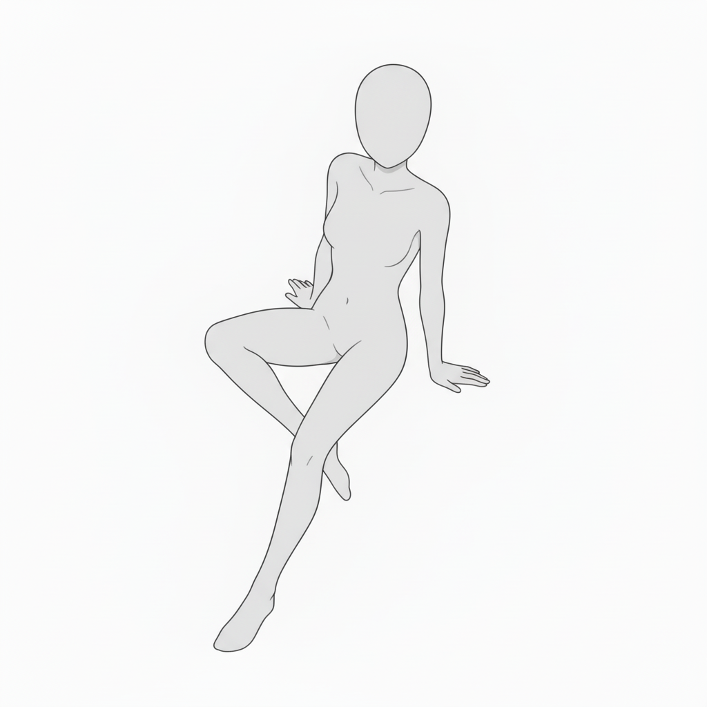 足をくずして落ち着いている様子を表すポーズ。日常シーンにも使いやすい基本姿勢。