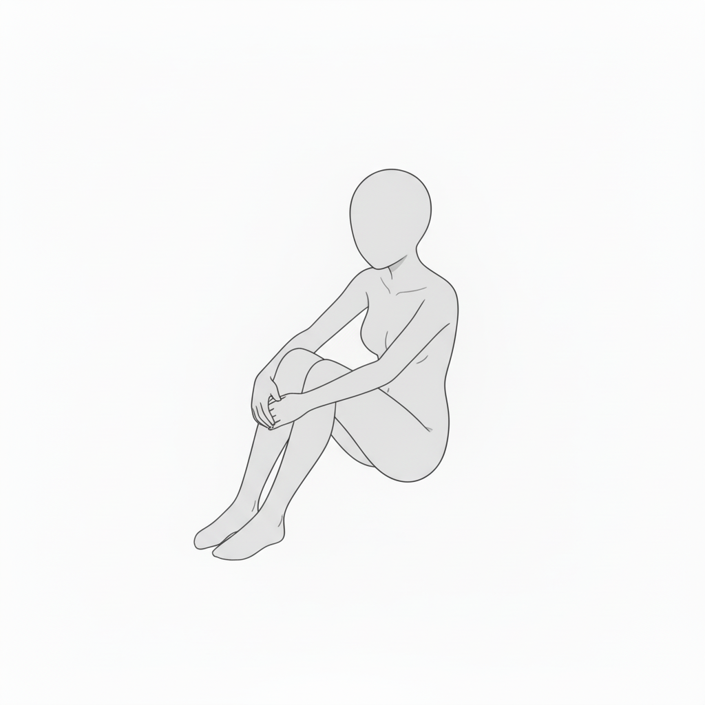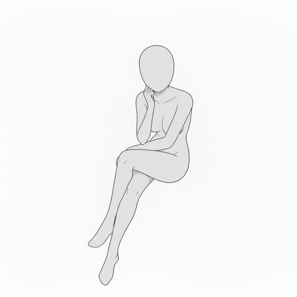 考えごとをしているような柔らかい印象の座り構図。感情表現の練習におすすめ。