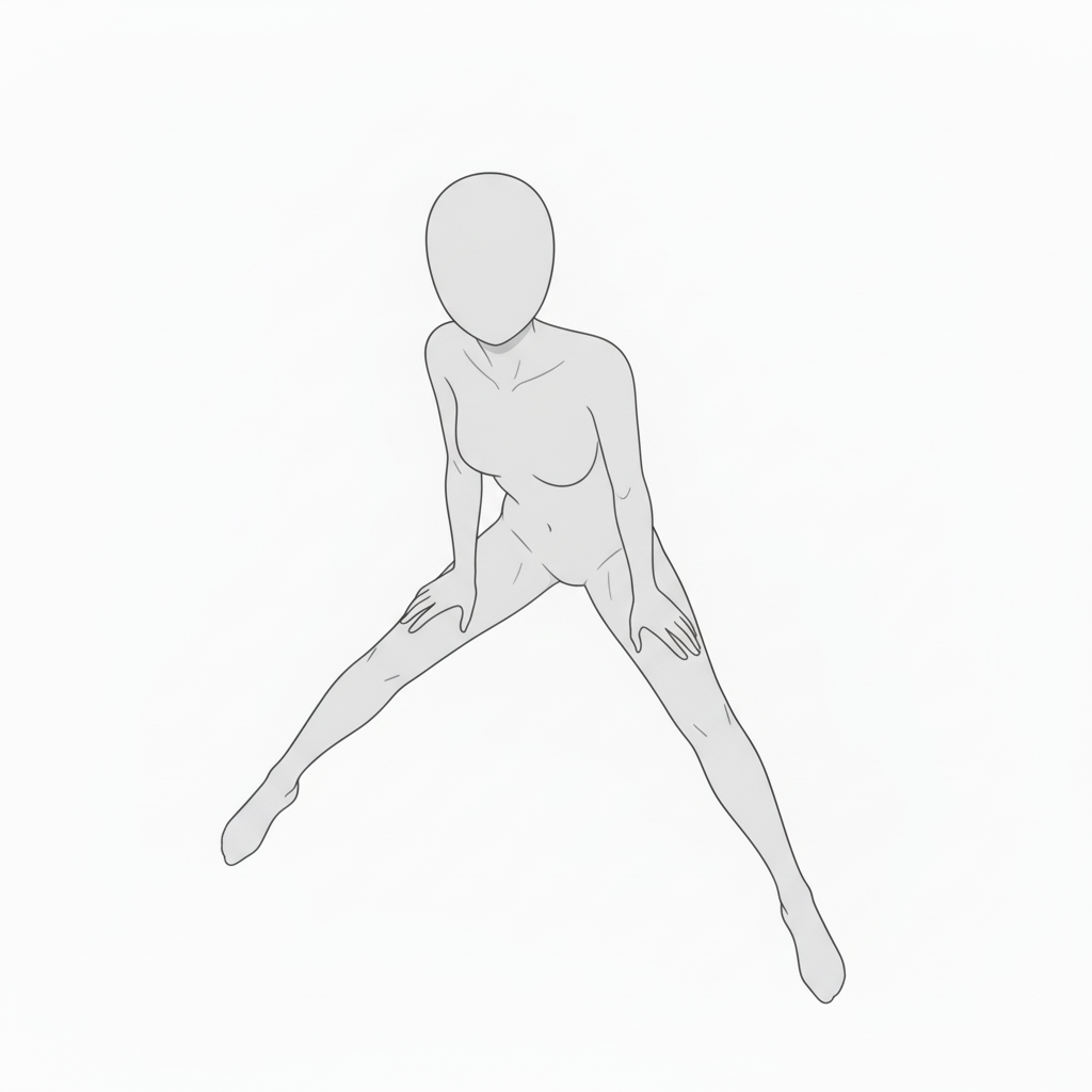 床に座って前傾する女性的なポーズ。可愛らしい雰囲気のキャラ制作に最適。