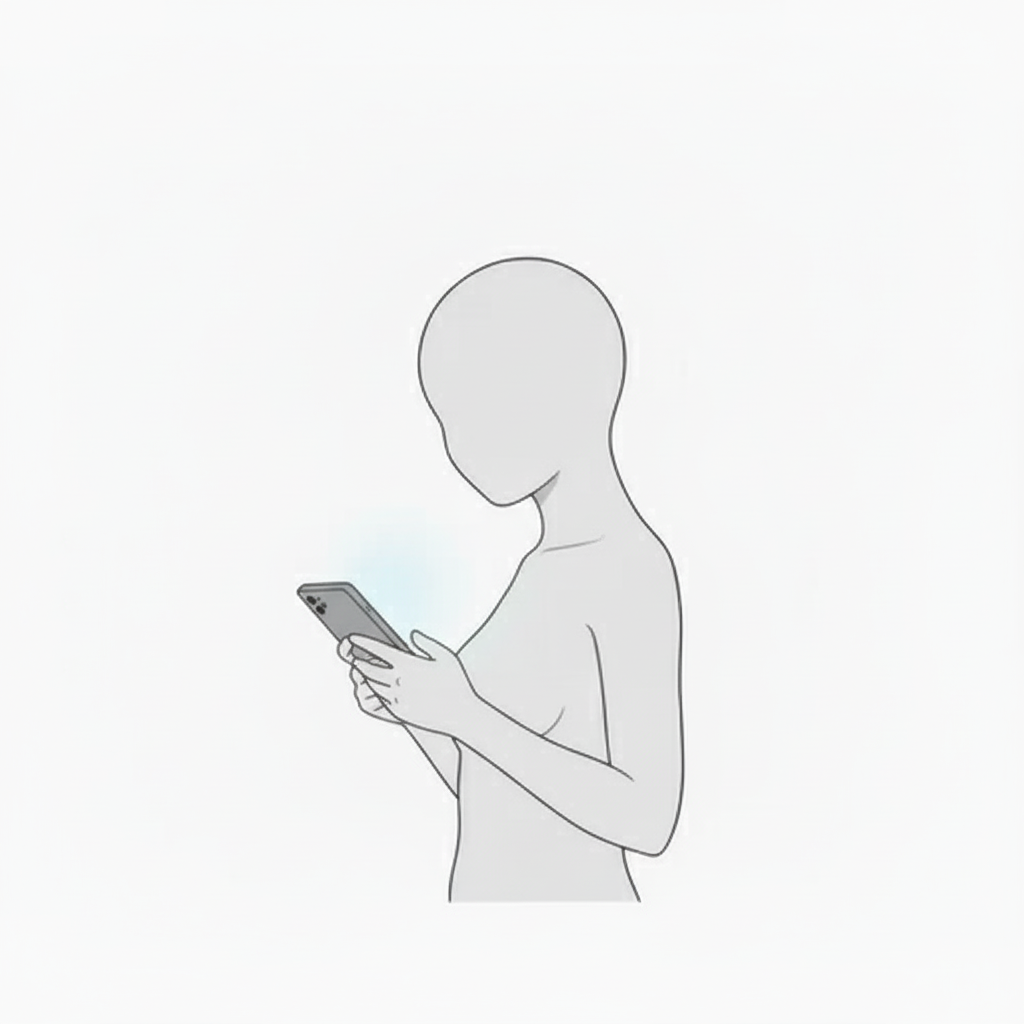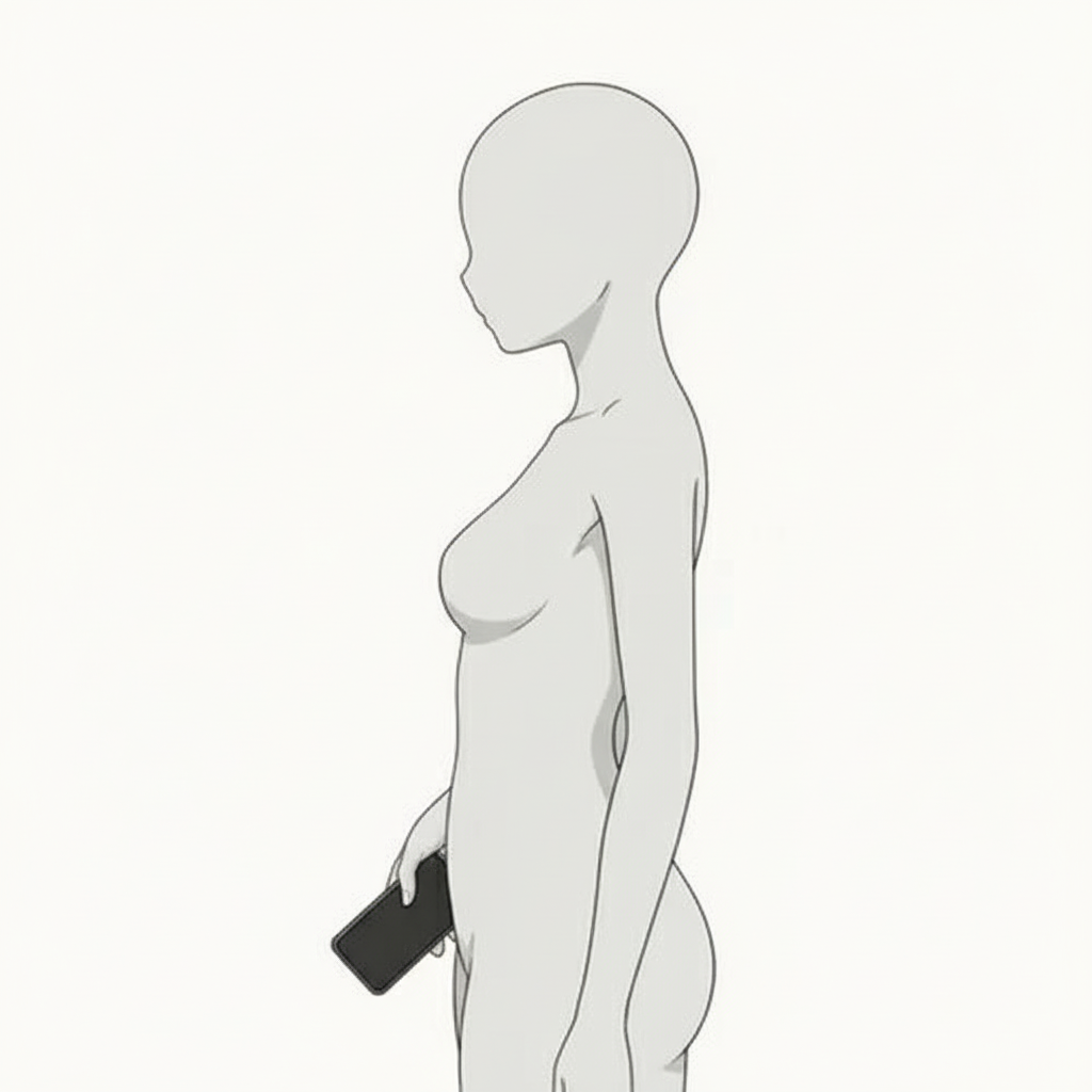下に構えたスマホを見つめる横姿で、歩行シーンや日常描写に活用できます。