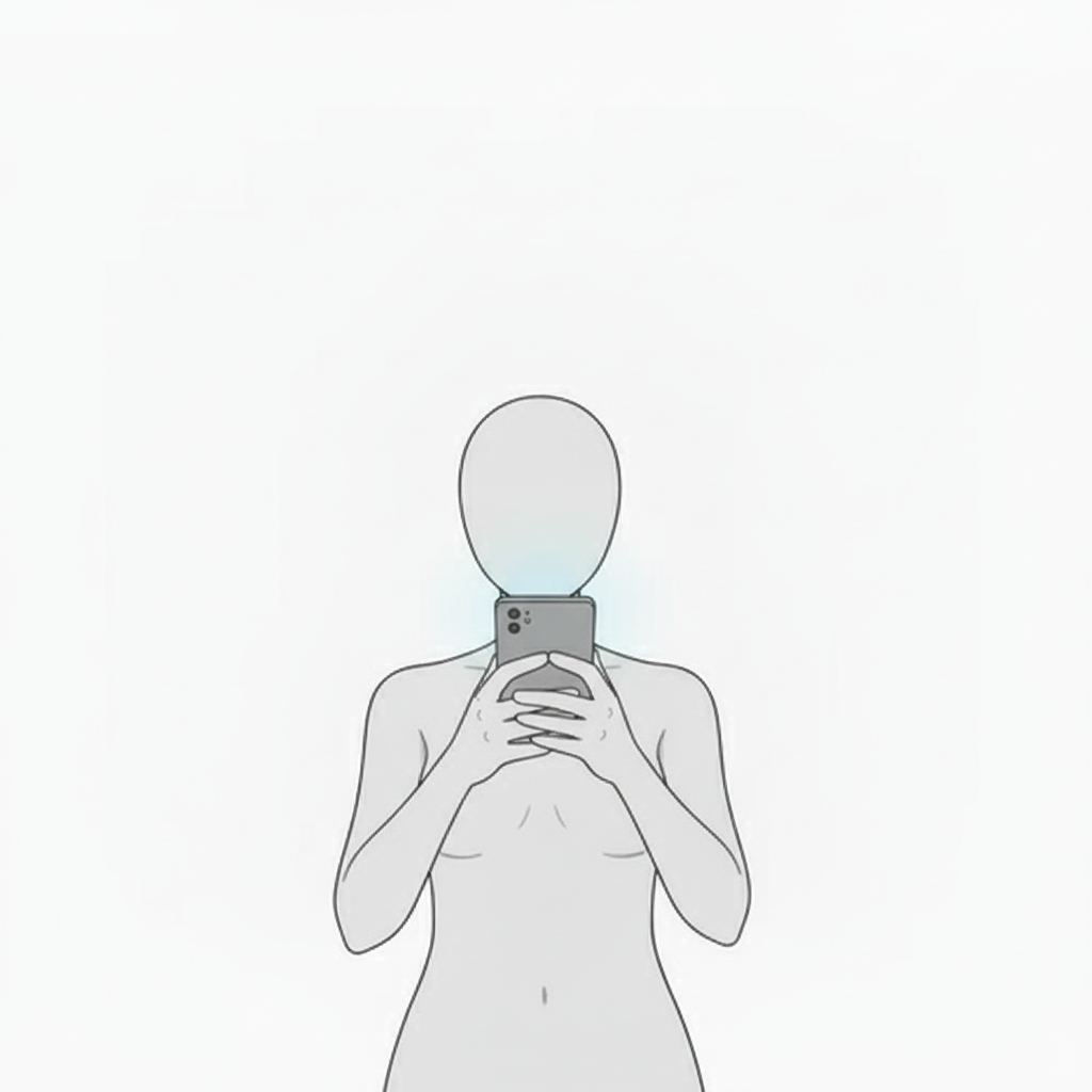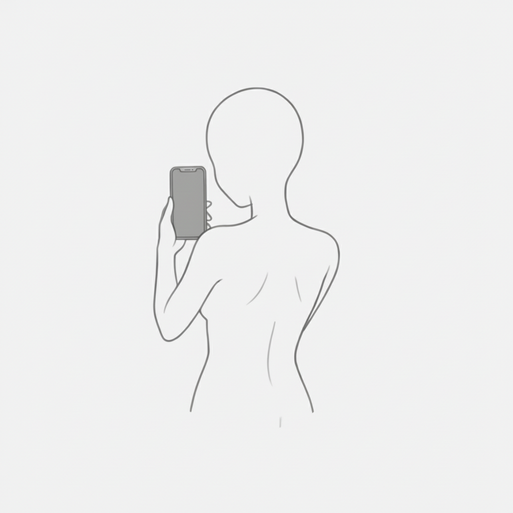 背中越しにスマートフォンを持つ姿を描いた、ストーリー演出に使えるポーズです。