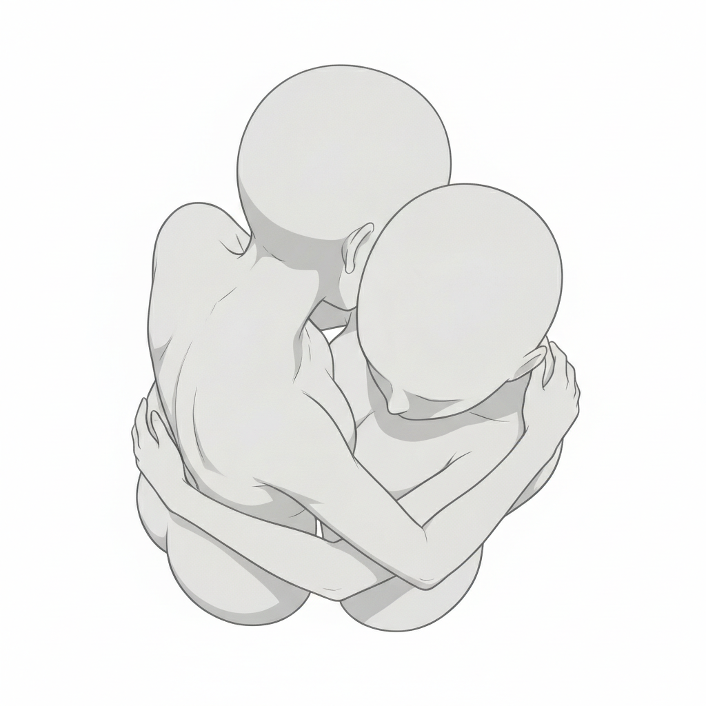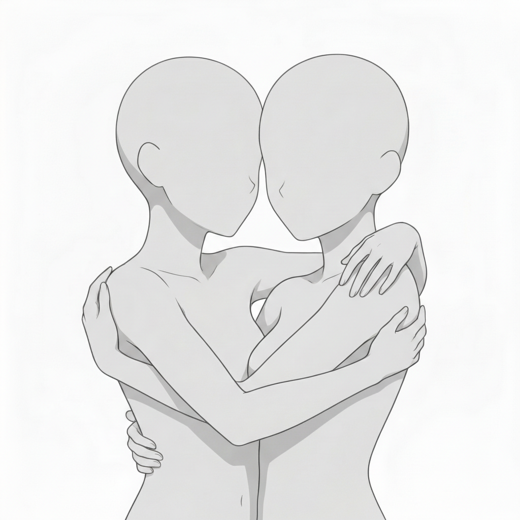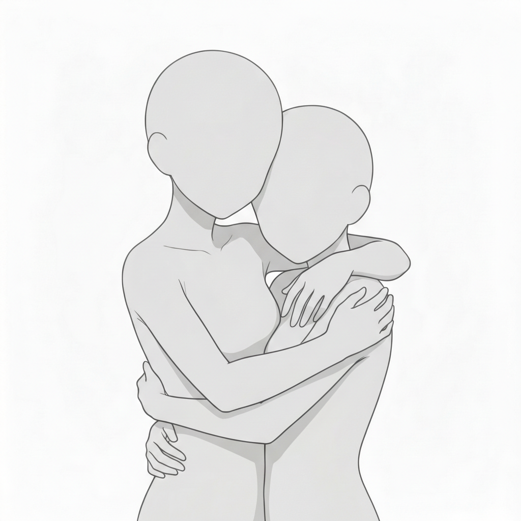 横から抱き合う構図が、落ち着いた関係性や静かな感情表現に向いています。