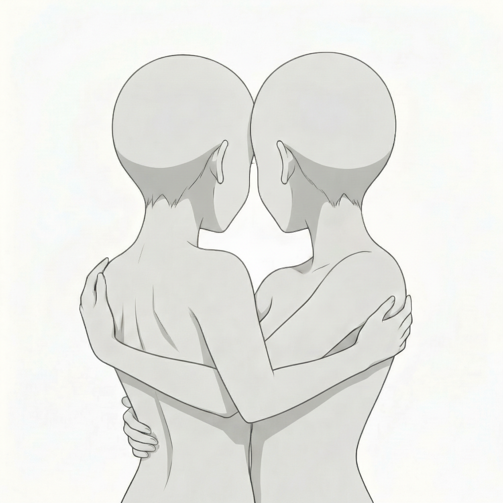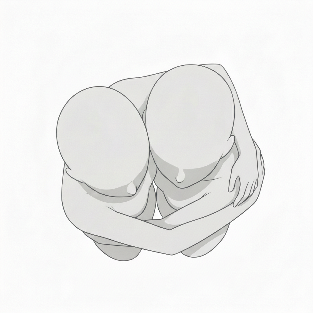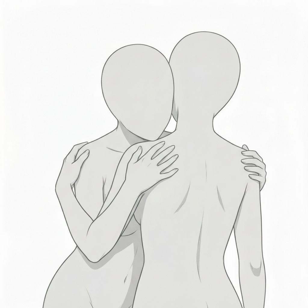 横から抱き合う構図が、落ち着いた関係性や静かな感情表現に向いています。
