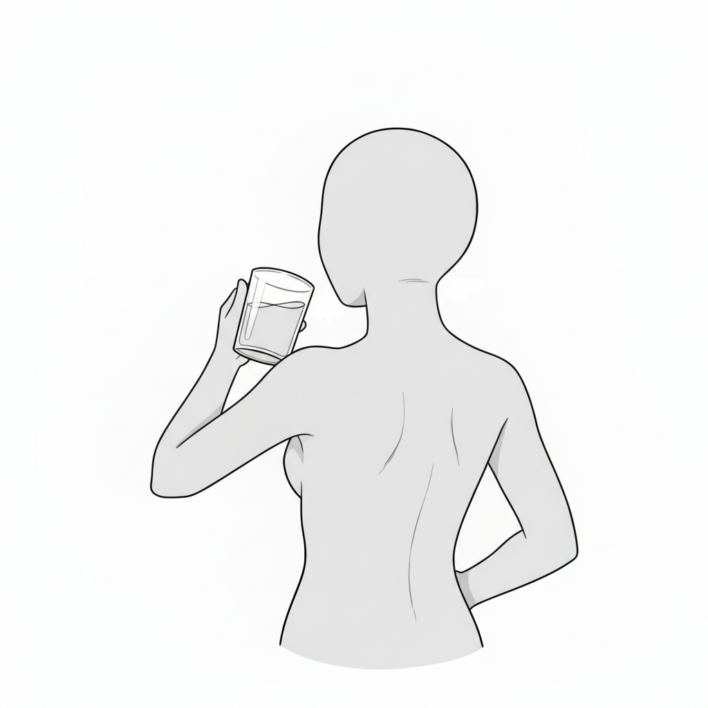 後ろ姿でコップを持ちうがいをする様子を描いた洗面シーン素材です。