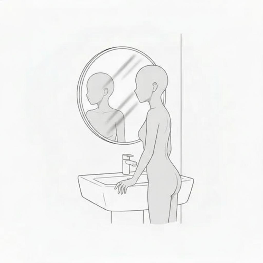 鏡越しに立つ女性の横向きポーズ|洗面所背景のイラスト素材