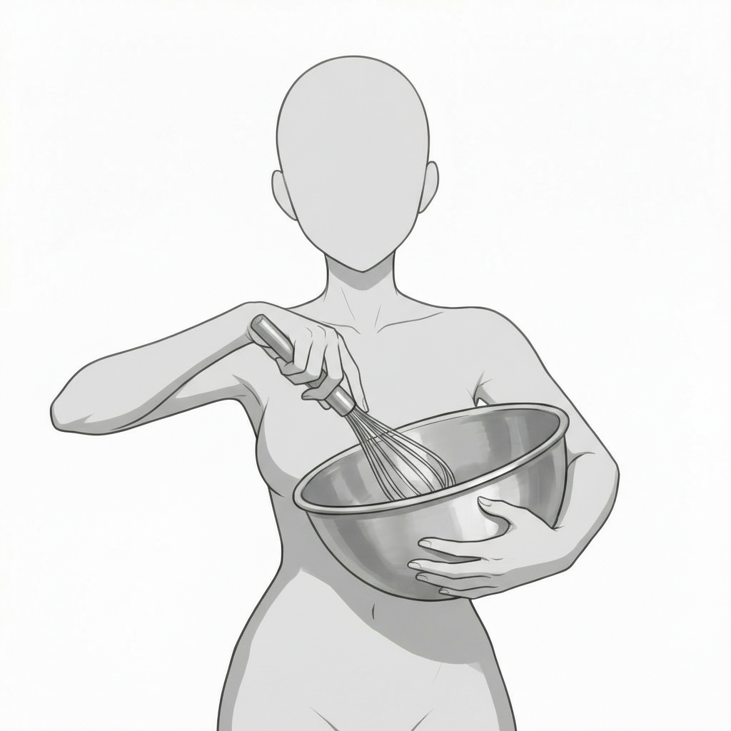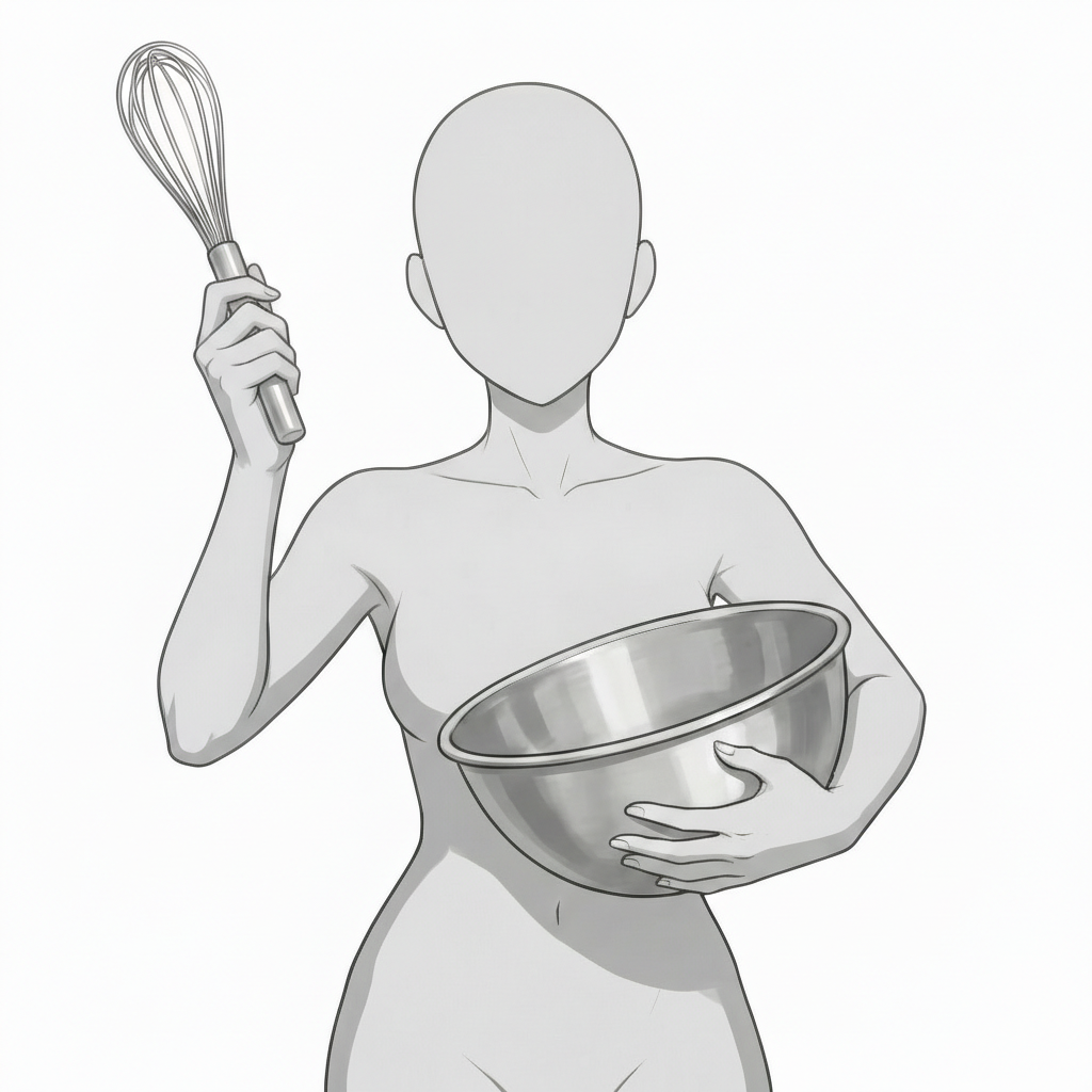泡立て器を持ち上げる女性|お菓子作りの準備動作ポーズ