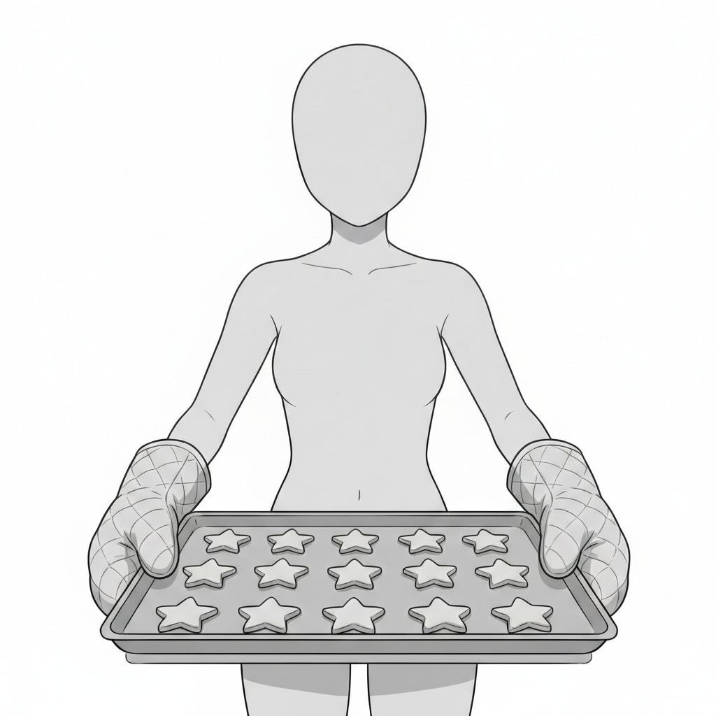 オーブン投入前のクッキー天板を持つ姿が、製菓シーンを具体的に演出します。