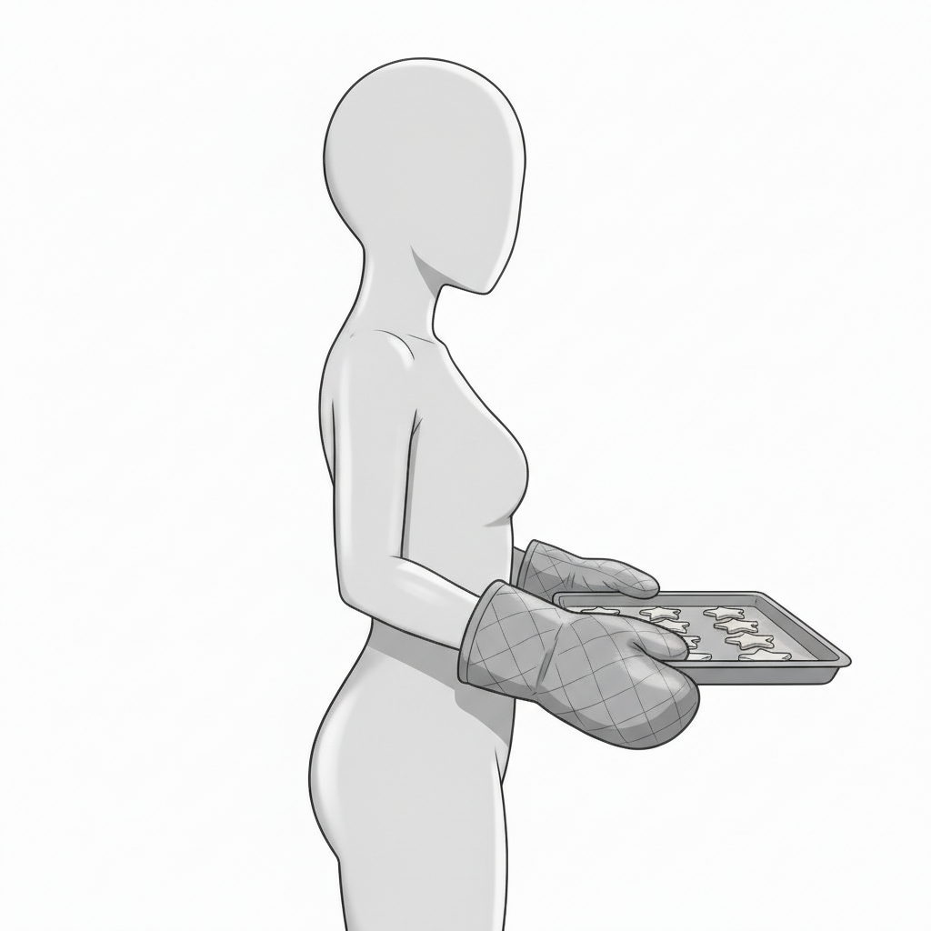 オーブンへ向かう動作を想起させる、自然な流れのあるポーズです。