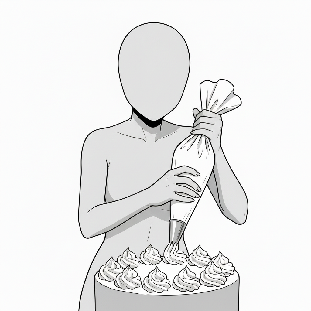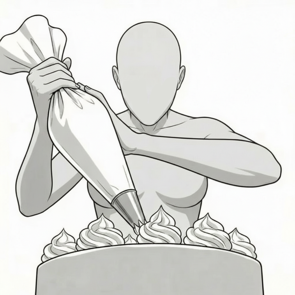 絞り袋を使った仕上げ工程を表現し、スイーツ制作の華やかさを強調します。