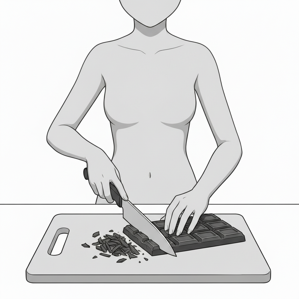 包丁でチョコレートを刻む工程を表現し、製菓準備シーンに使いやすいポーズです。