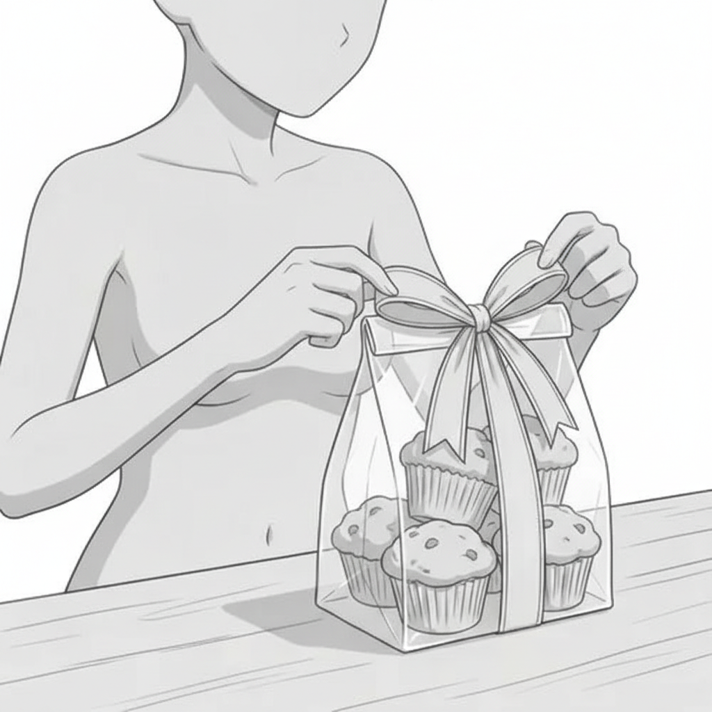 お菓子をラッピングする女性|手作りスイーツ完成ポーズ