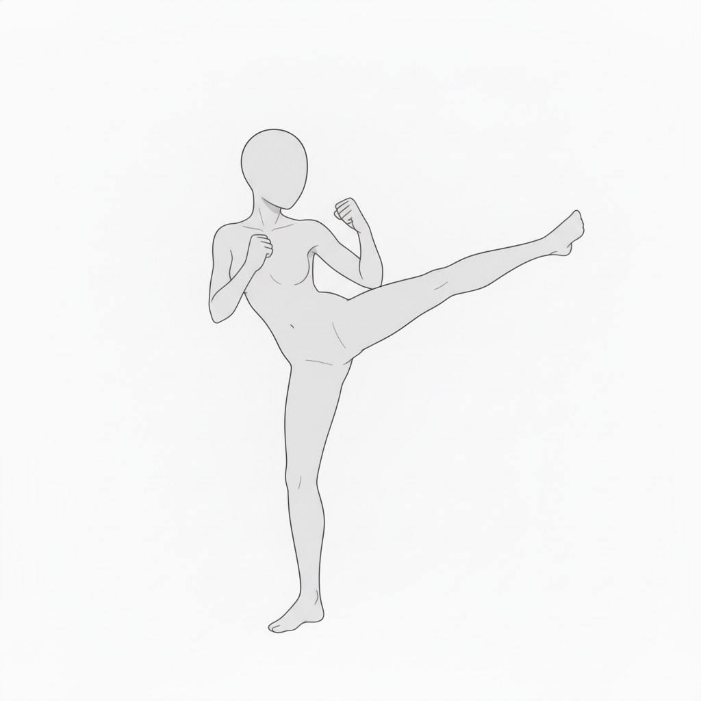 脚を高く上げた横蹴りの構えで、力強さとバランス感を表現できるポーズです。