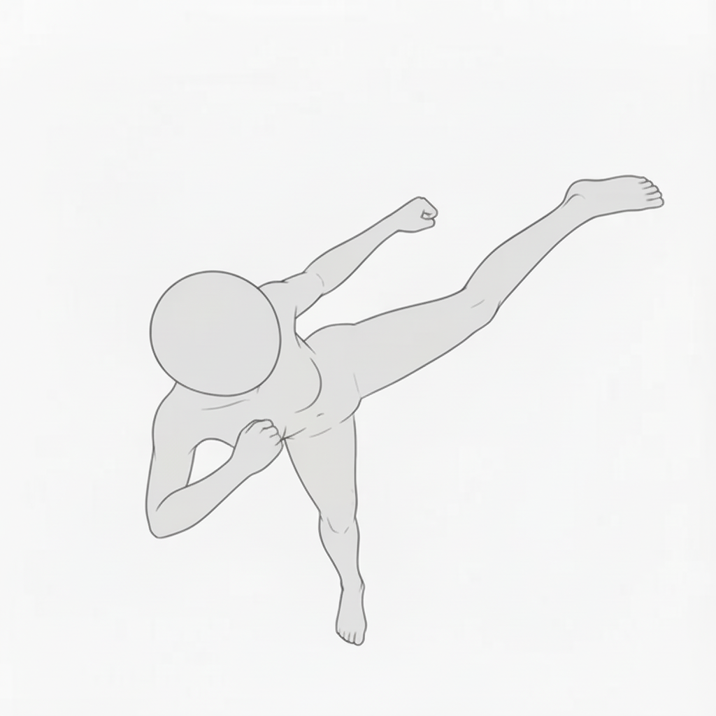 上から見下ろす構図で横蹴りを捉え、イラストや3D制作の参考にしやすい素材です。