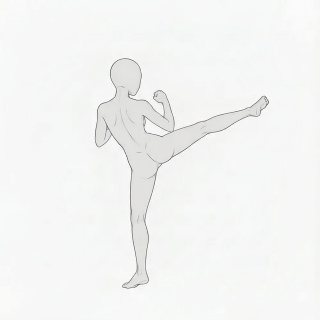 背後から見た横蹴り動作で、キャラクターの動きや筋肉の流れを表現しやすいポーズです。
