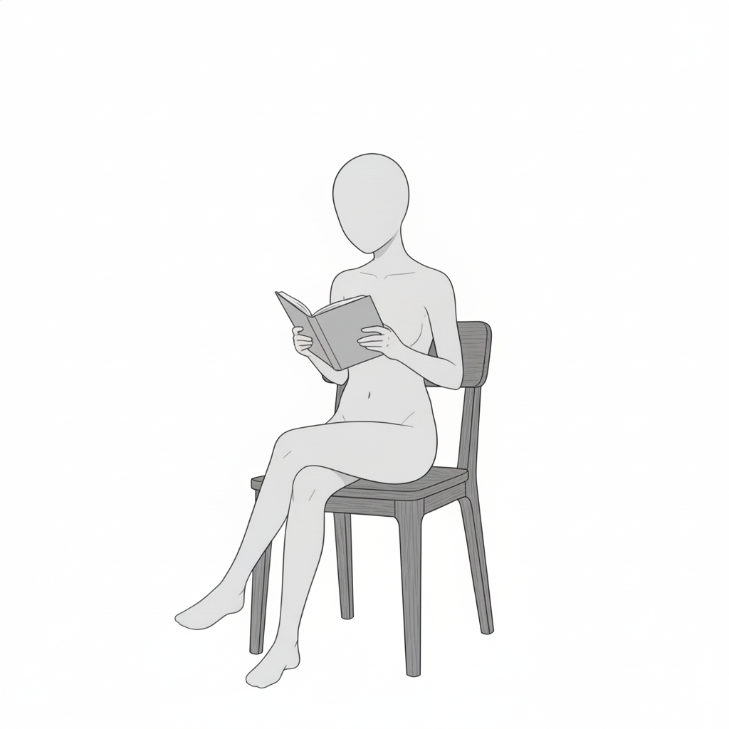 脚を組んで読書する女性の全身が見える基本ポーズで、イラストやデッサン資料に使いやすい構図です。