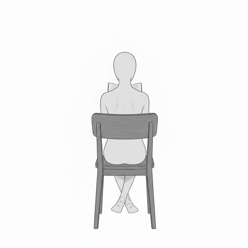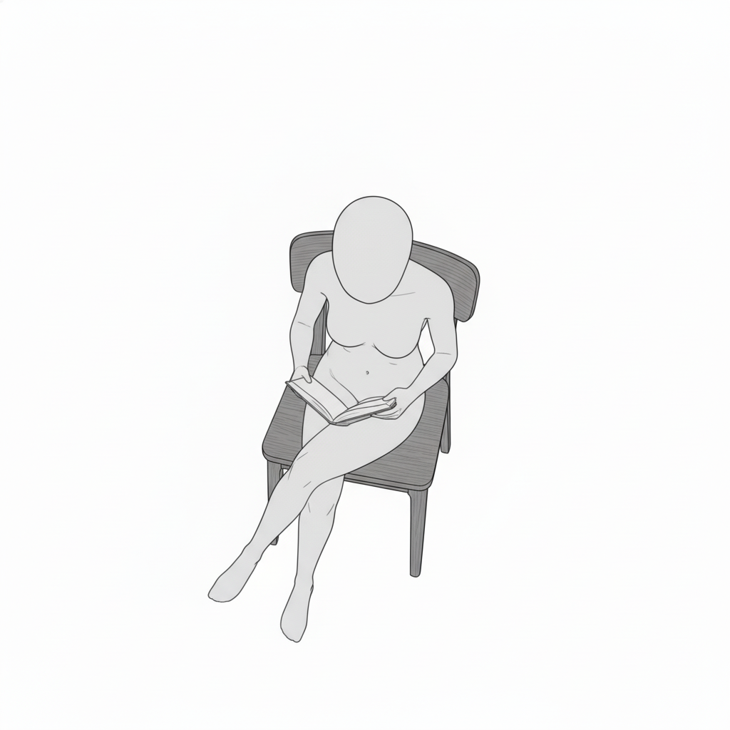 後ろ姿から読書する女性と椅子を描いたポーズで、静かな日常シーンや背景付きイラストの資料に最適です。