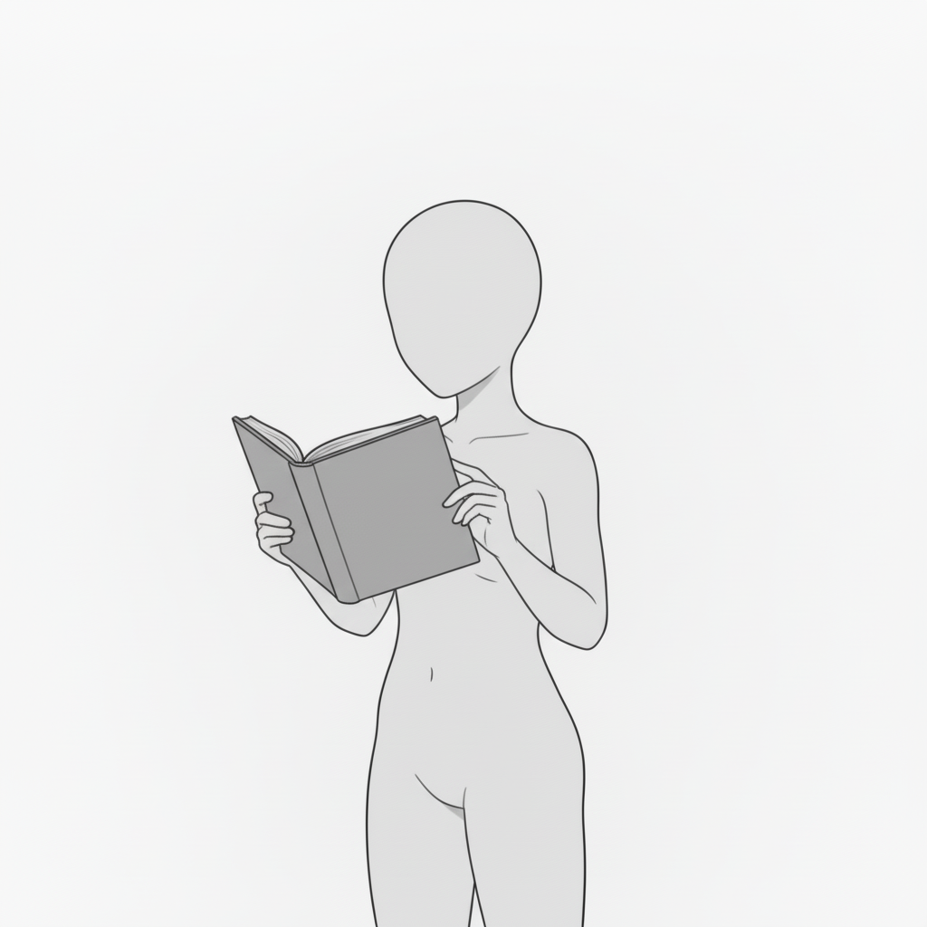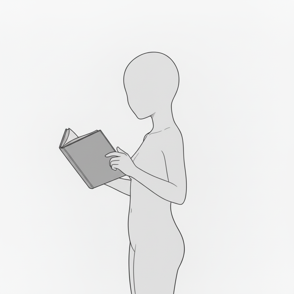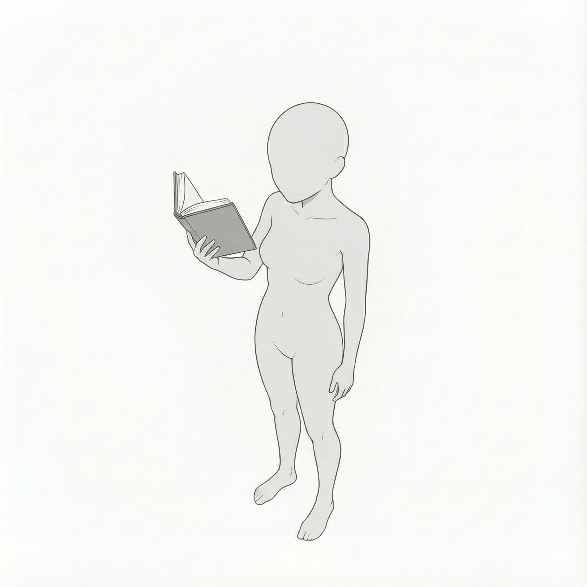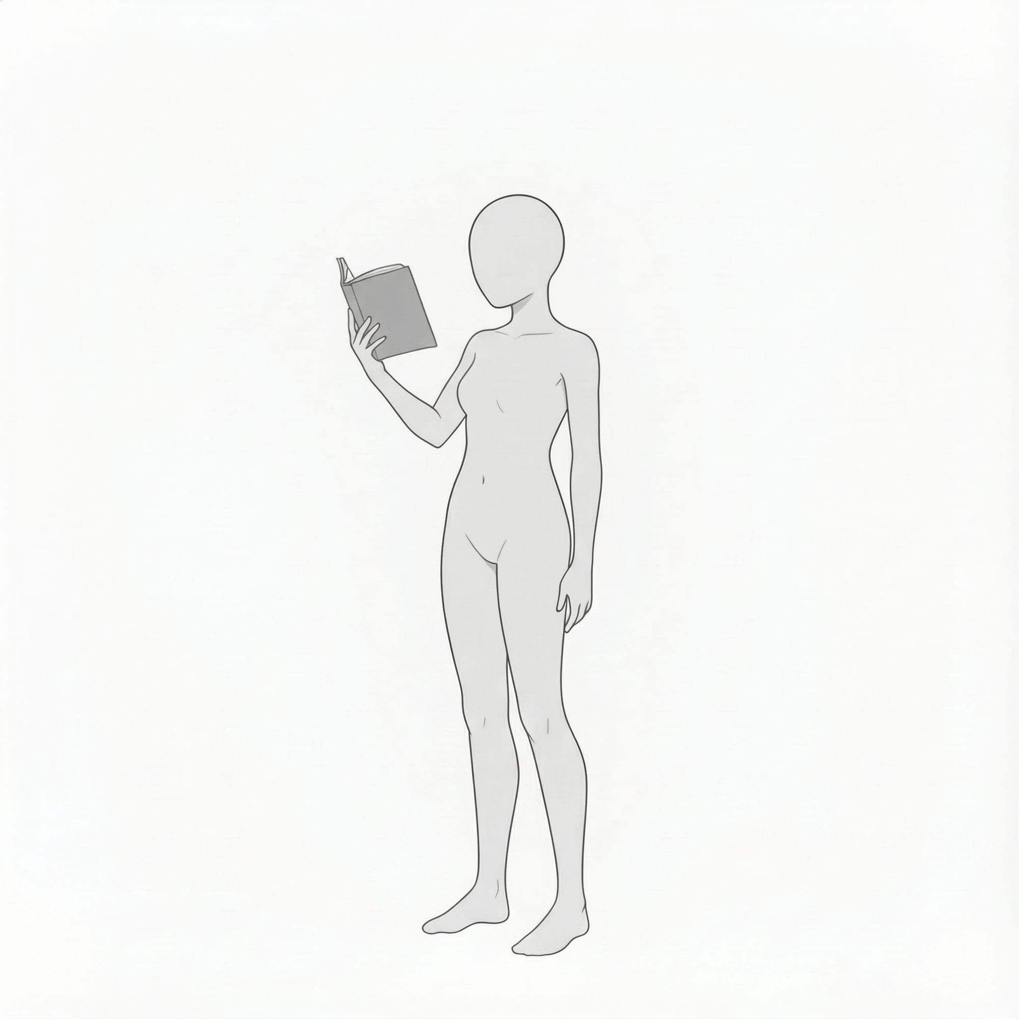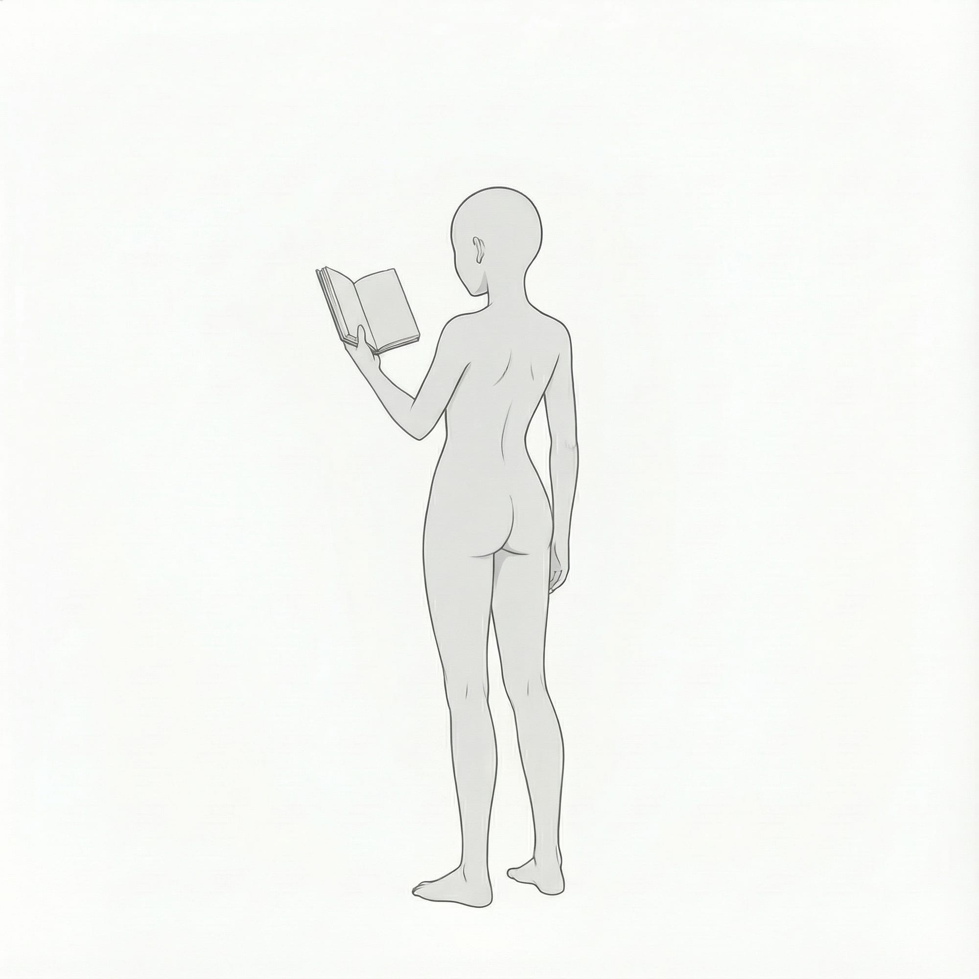 本を持って立つ女性を背面から捉えたシルエット重視のポーズで、物語性のある一枚絵や挿絵に使いやすいです。
