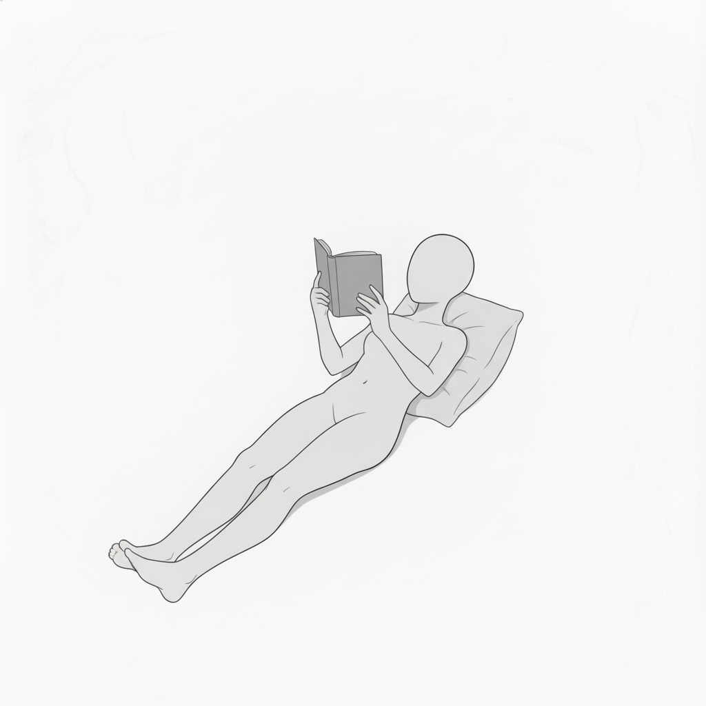 枕にもたれて本を読む女性|仰向けリラックスポーズ