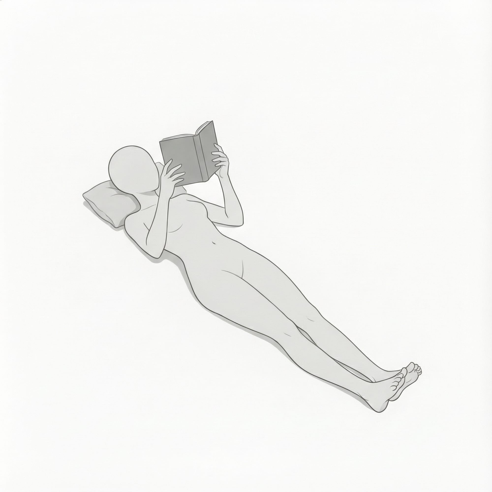 真上から寝転んで本を読む女性を捉えた全身構図で、パジャマ姿や室内イラストへのアレンジに使いやすいです。