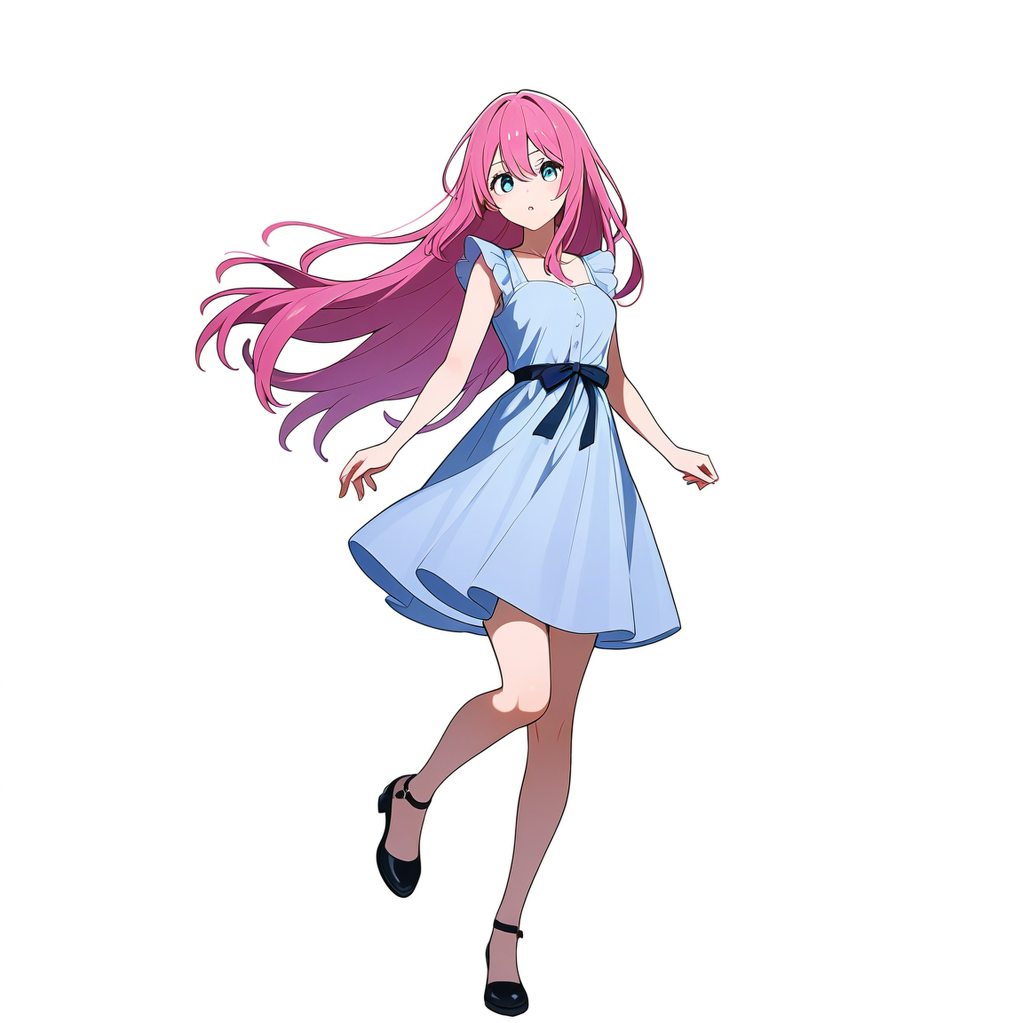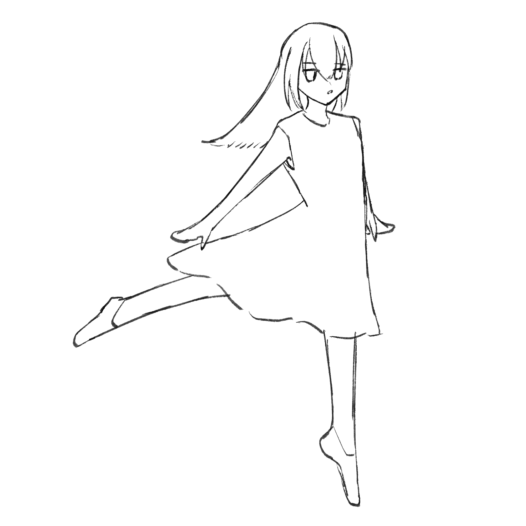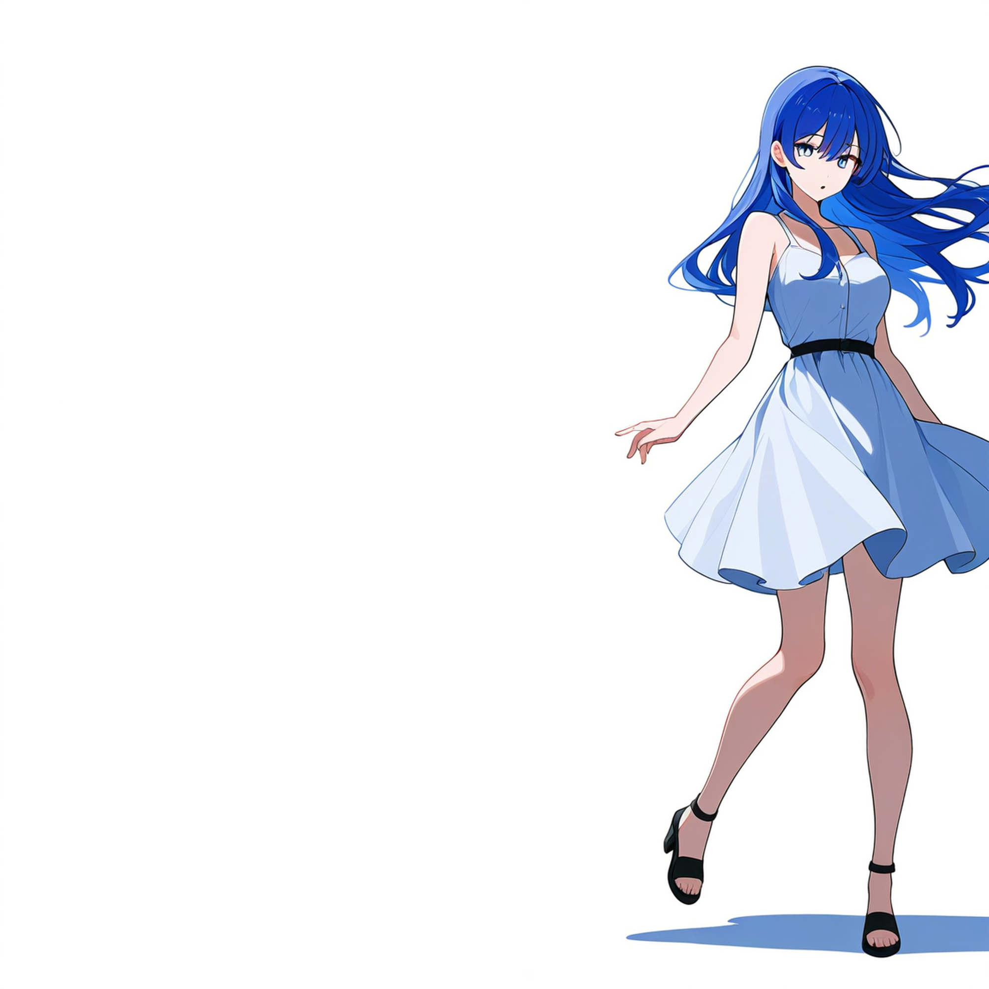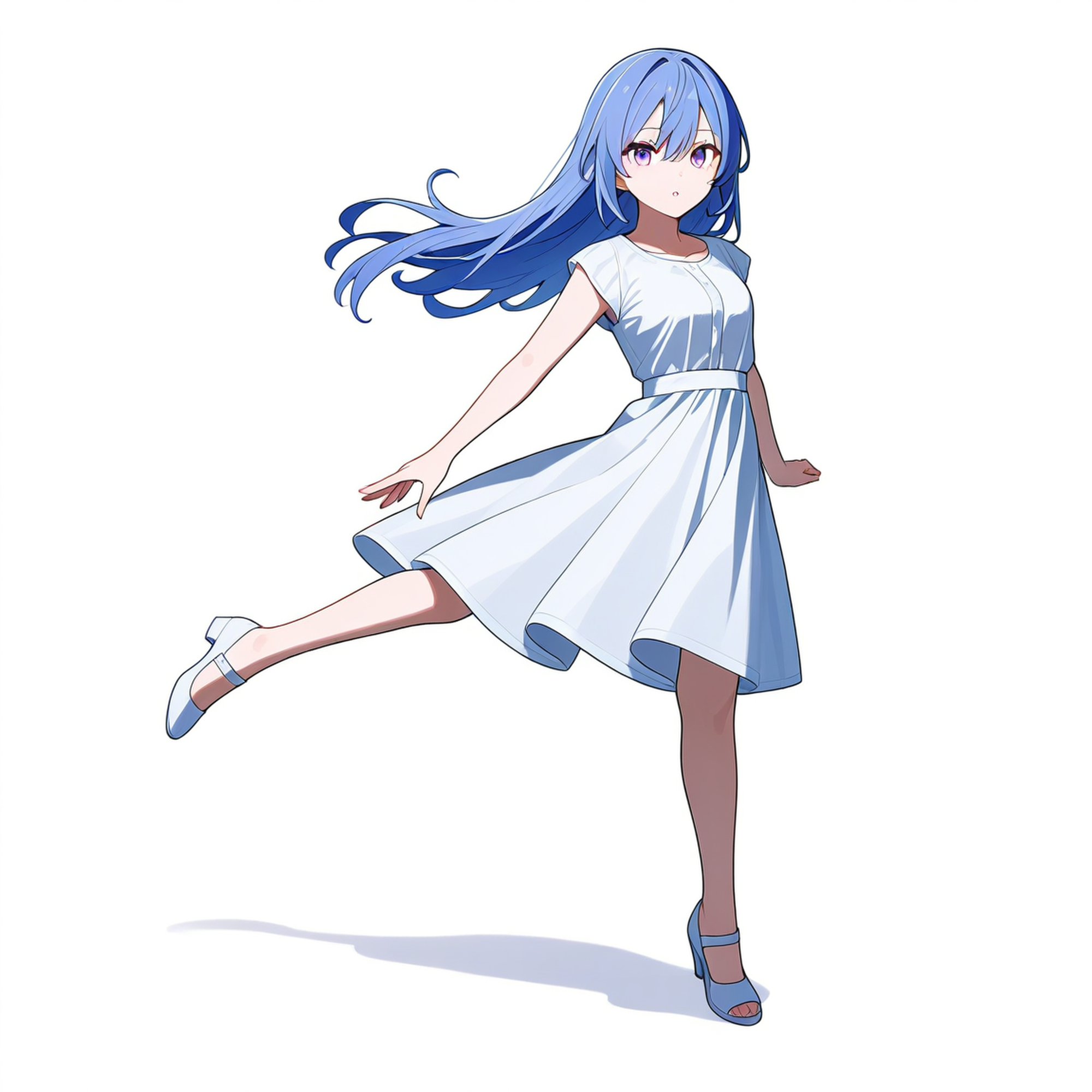 solo, long hair, looking at viewer, white background, dress, hair between eyes, standing, full body, parted lips, dress, floating hair, standing on one leg