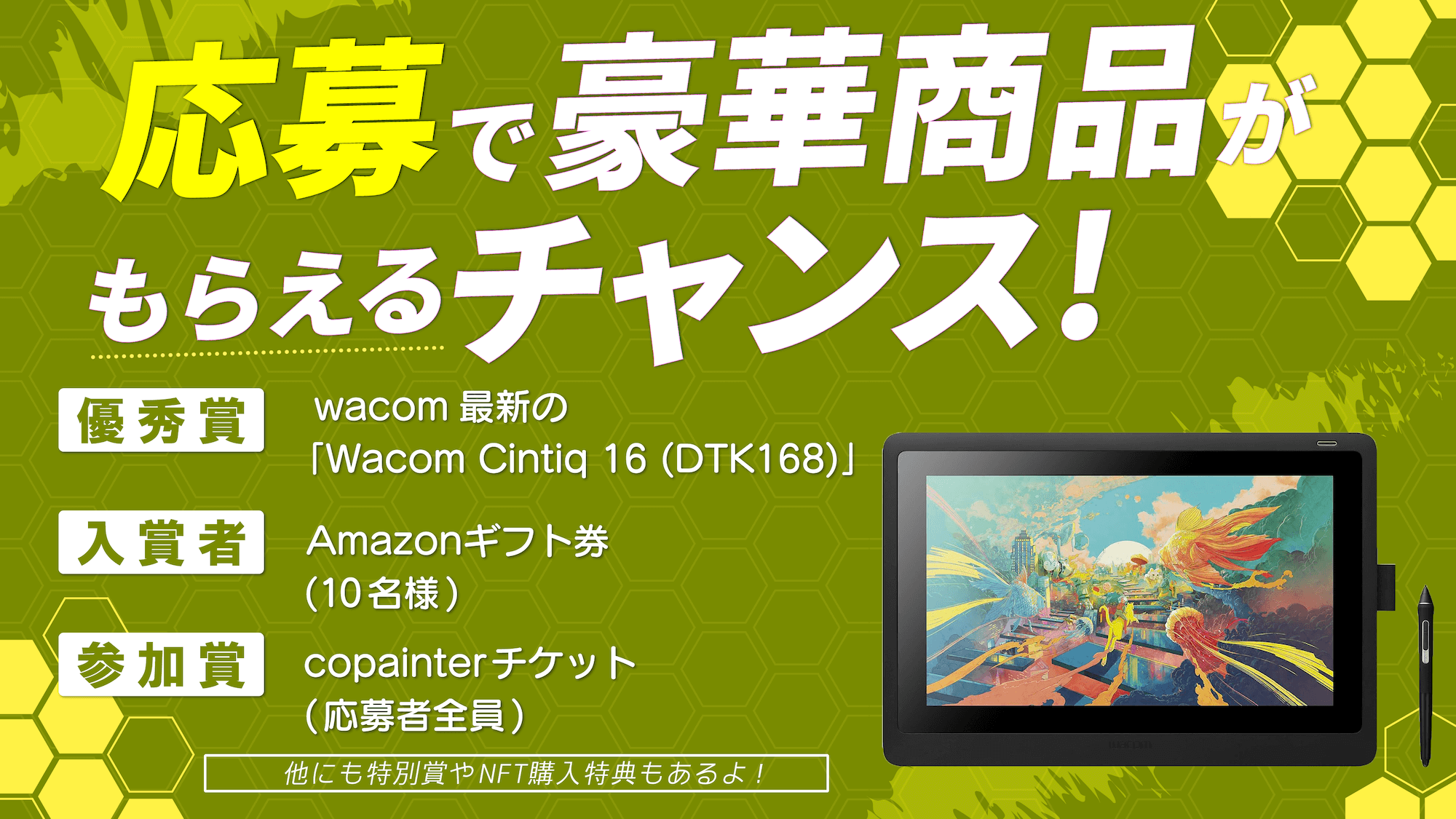 優秀作品には Wacom 液晶ペンタブレット「Cintiq 16」(11.8万円相当) や Amazonギフト券1万円分 など、豪華賞品をプレゼント!
