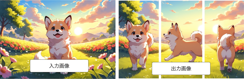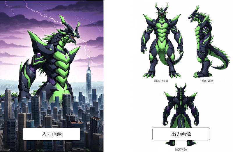 キャラクターの正面イラスト(もしくは正面に近くキャラクターの特徴をおさえているイラスト)を入力するだけで、AIが側面・背面を推定して生成してくれます。 - 一貫性の高い出力