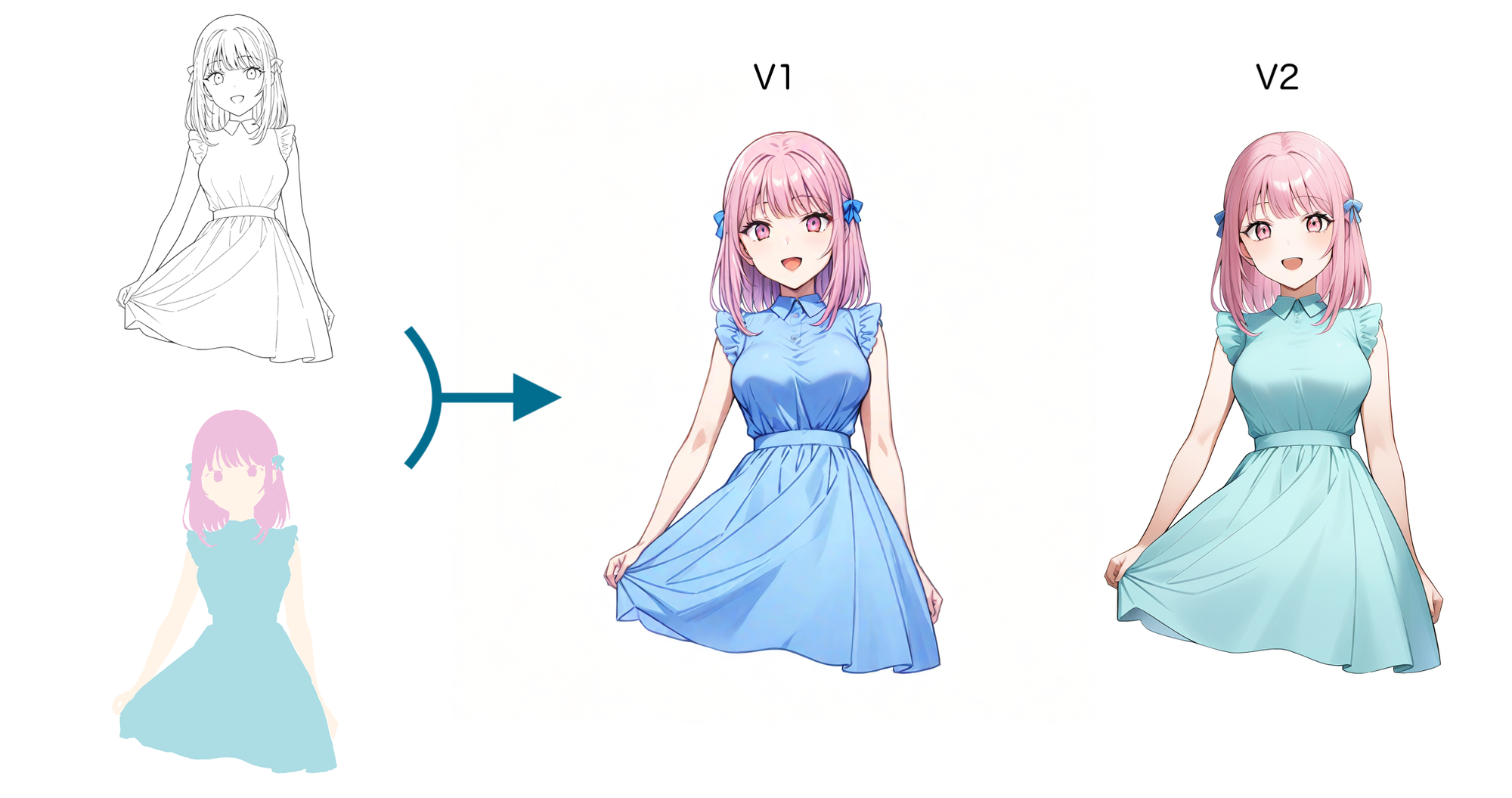 copainter では線画と下塗りから着彩をする「着彩」機能を提供しております。この機能では皆様が手書きした線画と下塗りの色を大事にしながらAI が着彩をいたします。